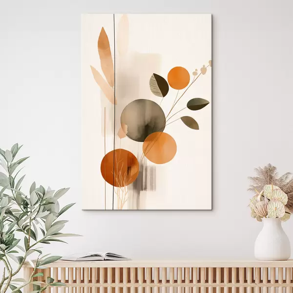 Cuadros Imitación de pintura abstracta con círculos naranjas y grises, hojas y ramas, estilo moderno, efecto acuarela. Nr s46697