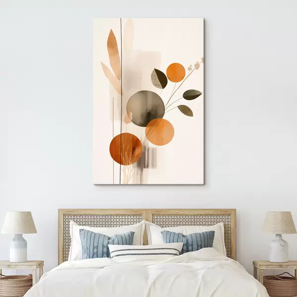Cuadros Imitación de pintura abstracta con círculos naranjas y grises, hojas y ramas, estilo moderno, efecto acuarela. Nr s46697