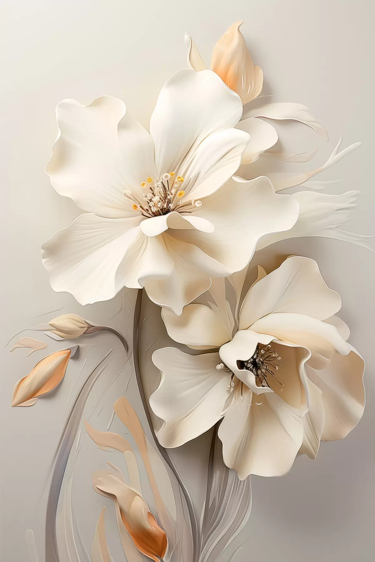 murales de pared Flores blancas, pétalos con sombras suaves, fondo beige claro, composición elegante, estilo minimalista. s46700
