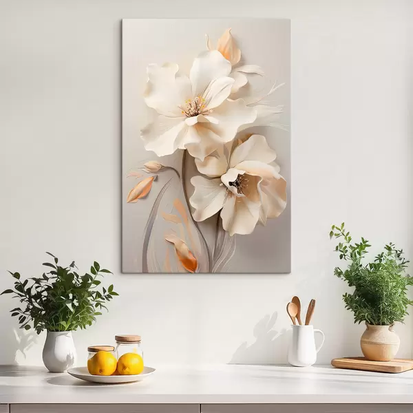 Cuadros Flores blancas, pétalos con sombras suaves, fondo beige claro, composición elegante, estilo minimalista. Nr s46700