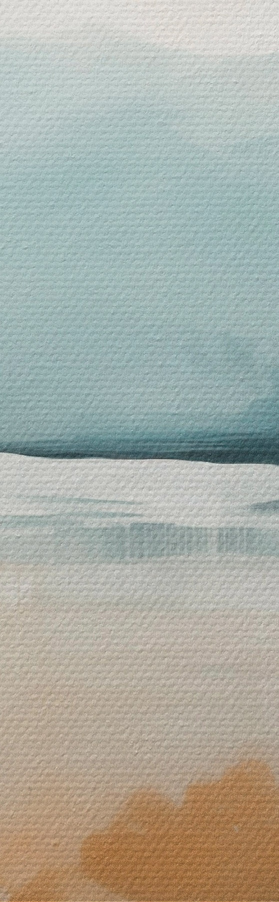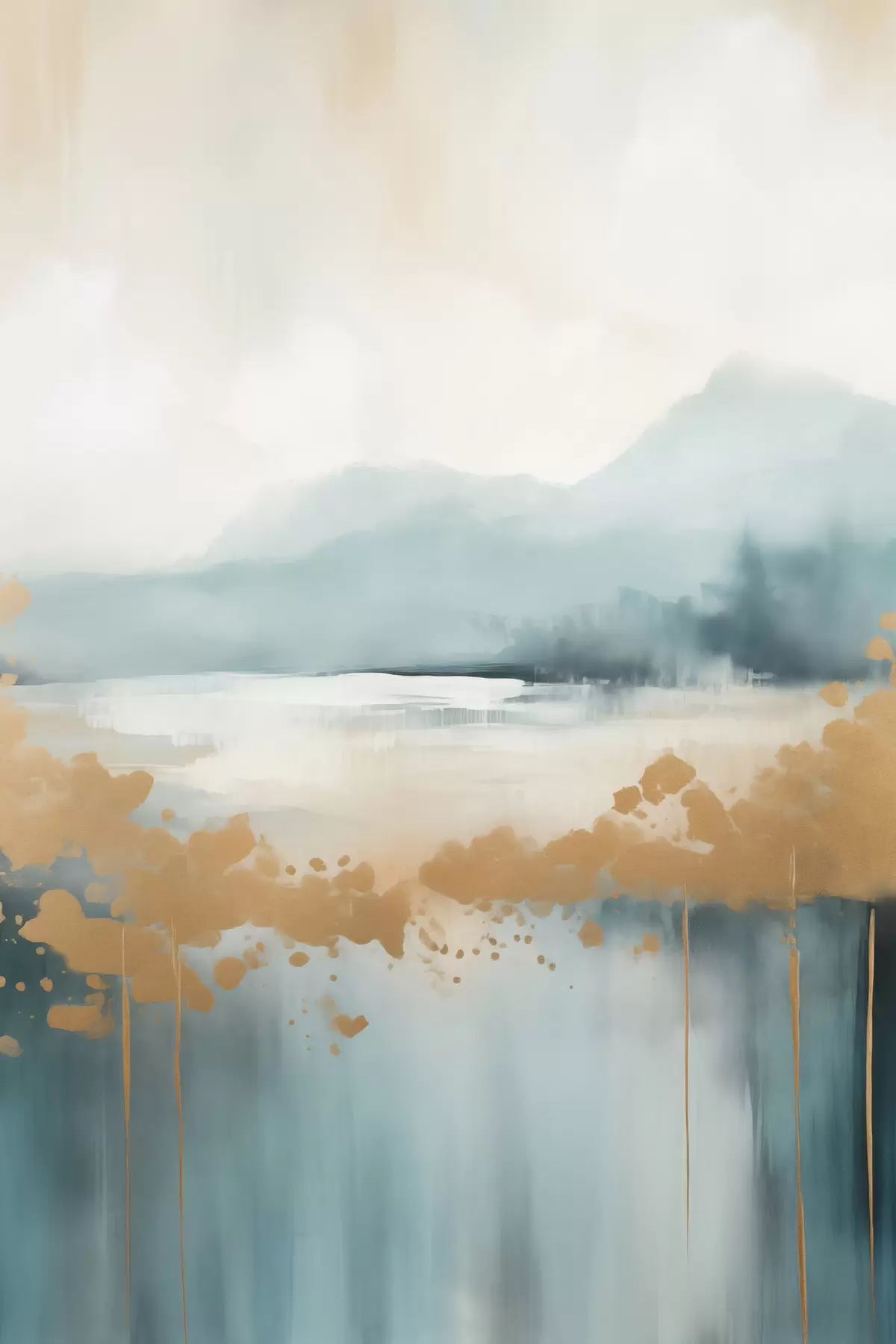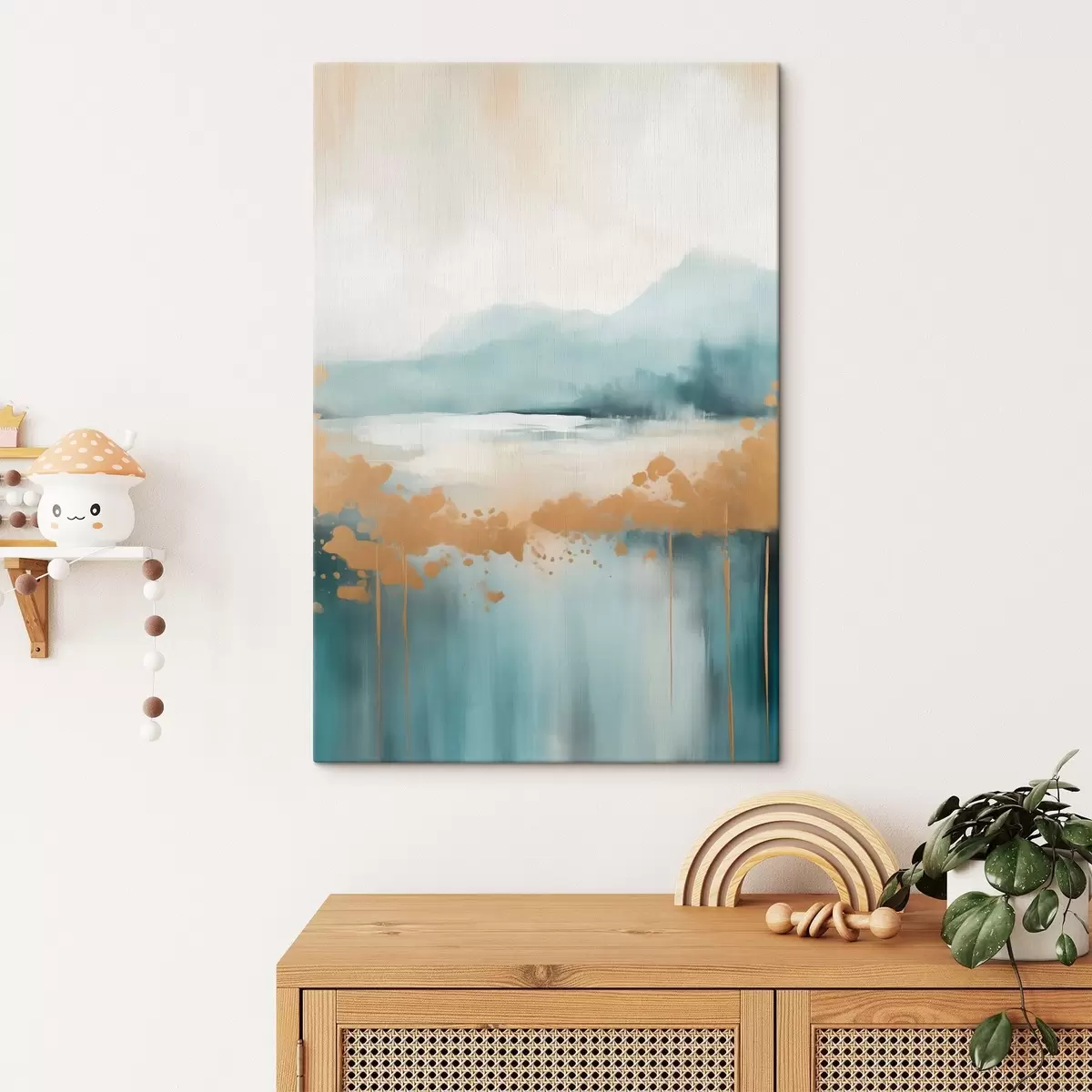 murales de pared Paisaje abstracto con montañas y lago en verde azulado y amarillo texturizado, pinceladas suaves, obra de arte minimalista. s46703