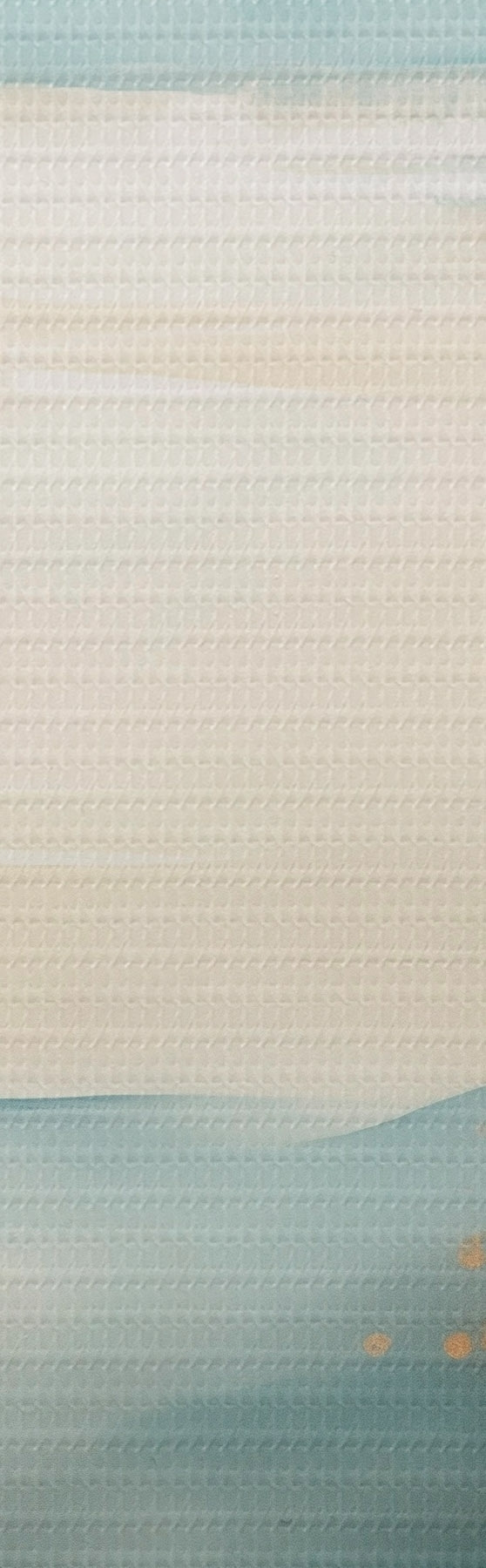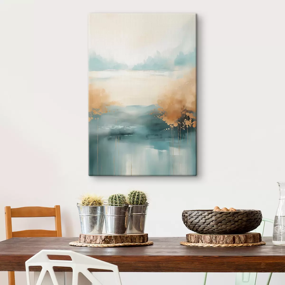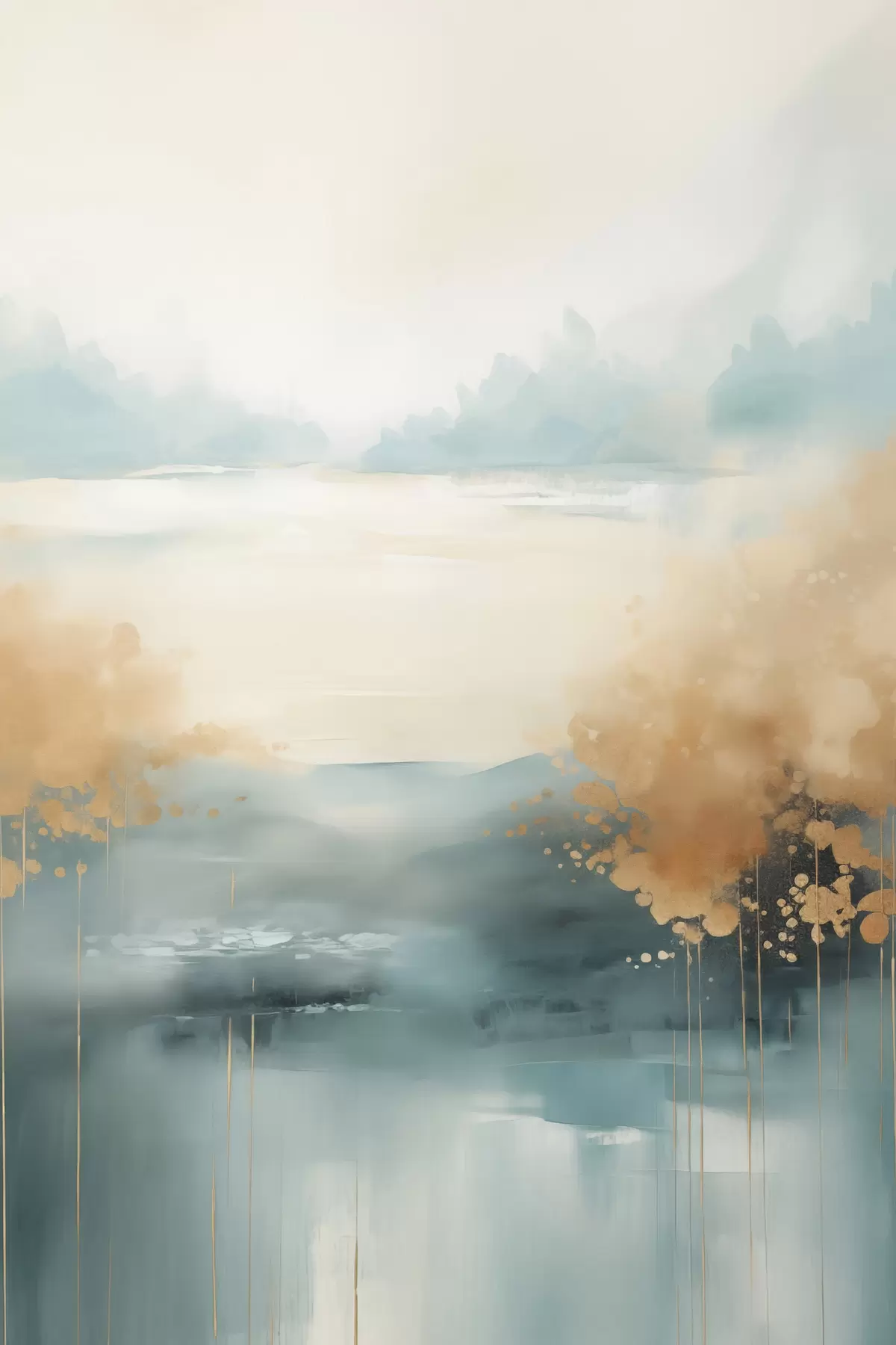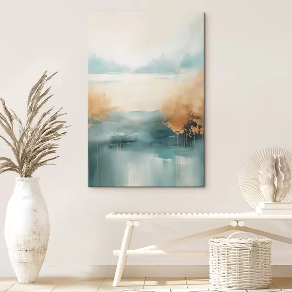 murales de pared Paisaje abstracto con montañas y lago en verde azulado y amarillo texturizado, pinceladas suaves, obra de arte minimalista. s46704