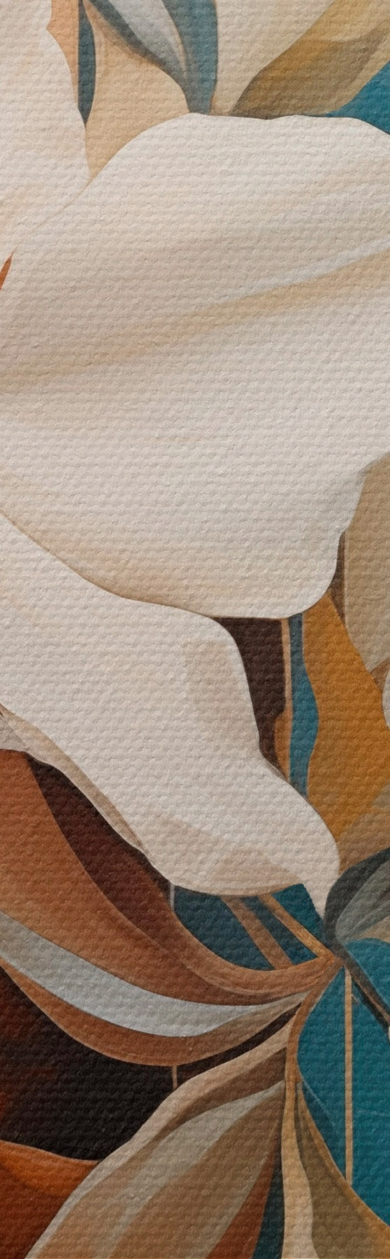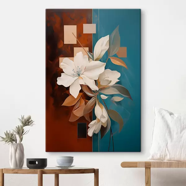 Cuadros Flores y hojas blancas abstractas con un fondo marrón y azul con formas abstractas, en un estilo minimalista. Nr s46709