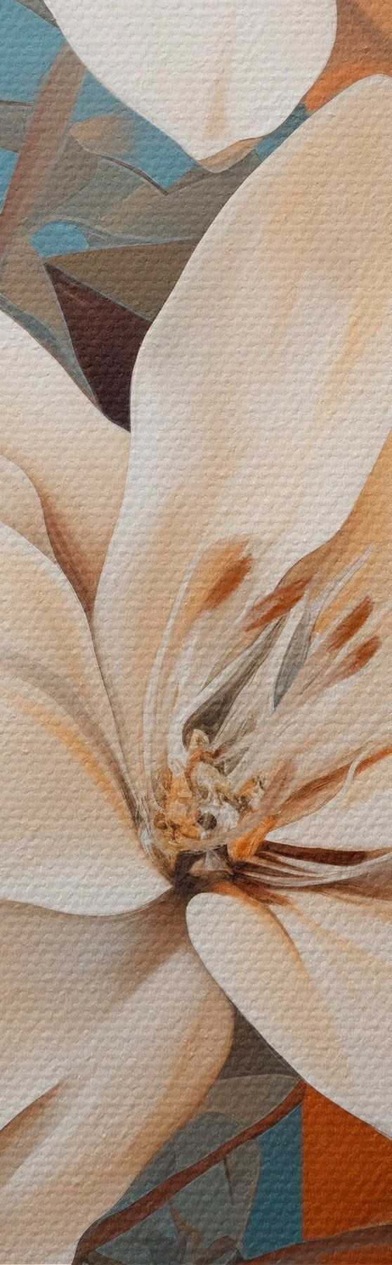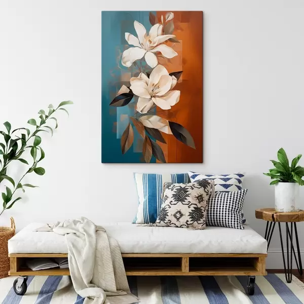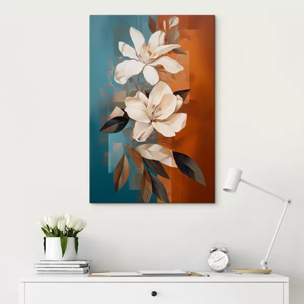 Cuadros Flores y hojas blancas abstractas con un fondo marrón y azul con formas abstractas, en un estilo minimalista. Nr s46710