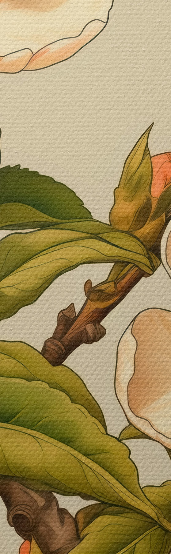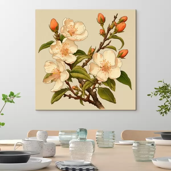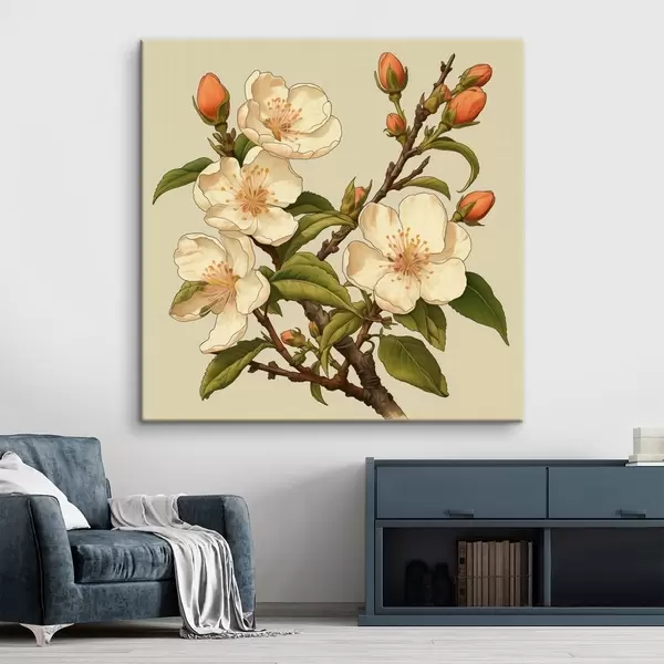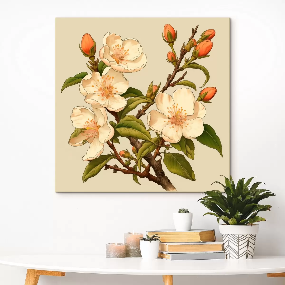 Cuadros Rama florecida con flores blancas sobre fondo beige al estilo de una ilustración clásica. Nr s46923