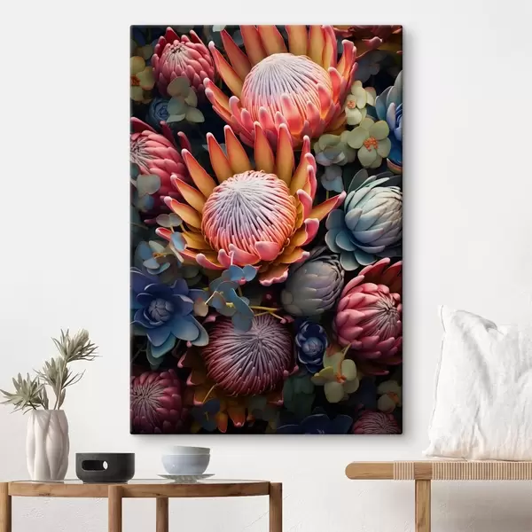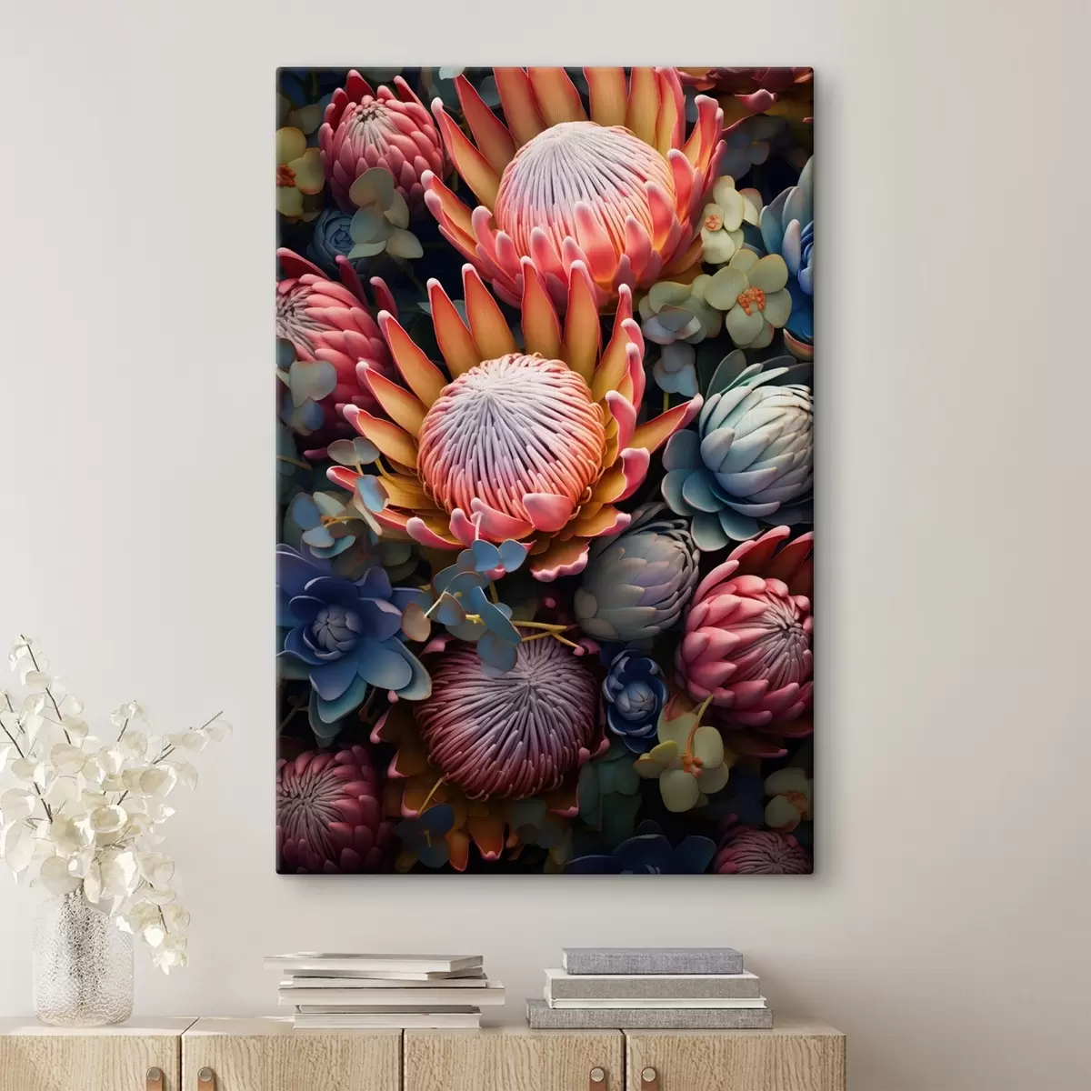 Cuadros Composición de proteas, eucaliptos y suculentas en un estilo artístico digital fotorrealista. Nr s46925