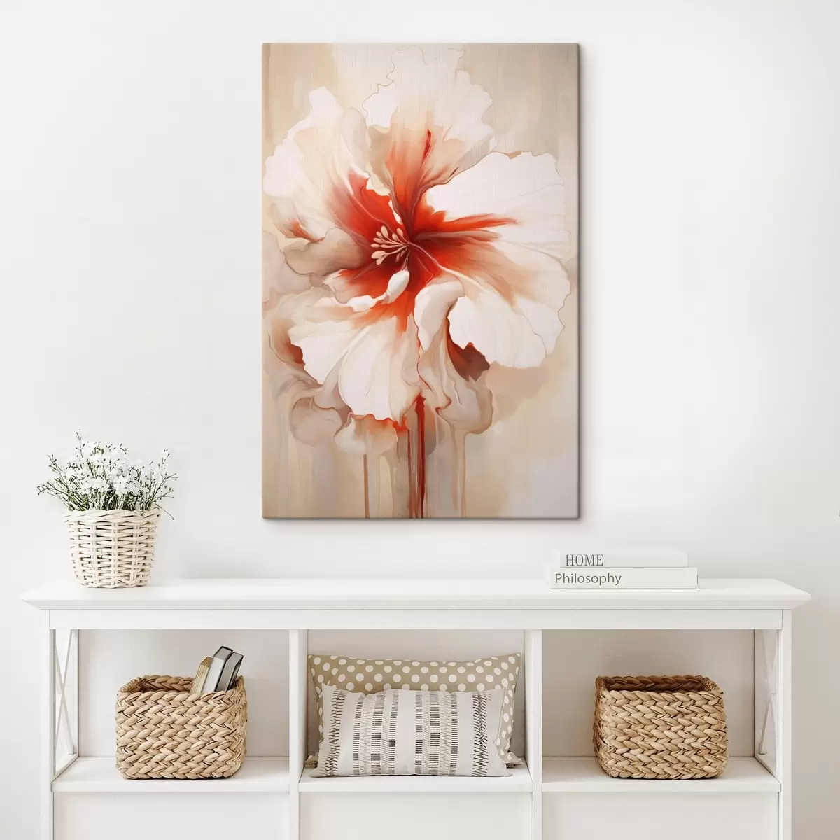 Cuadros Primer plano de una flor blanca y roja con pétalos semitransparentes y gotas de pintura fluidas. Nr s46941