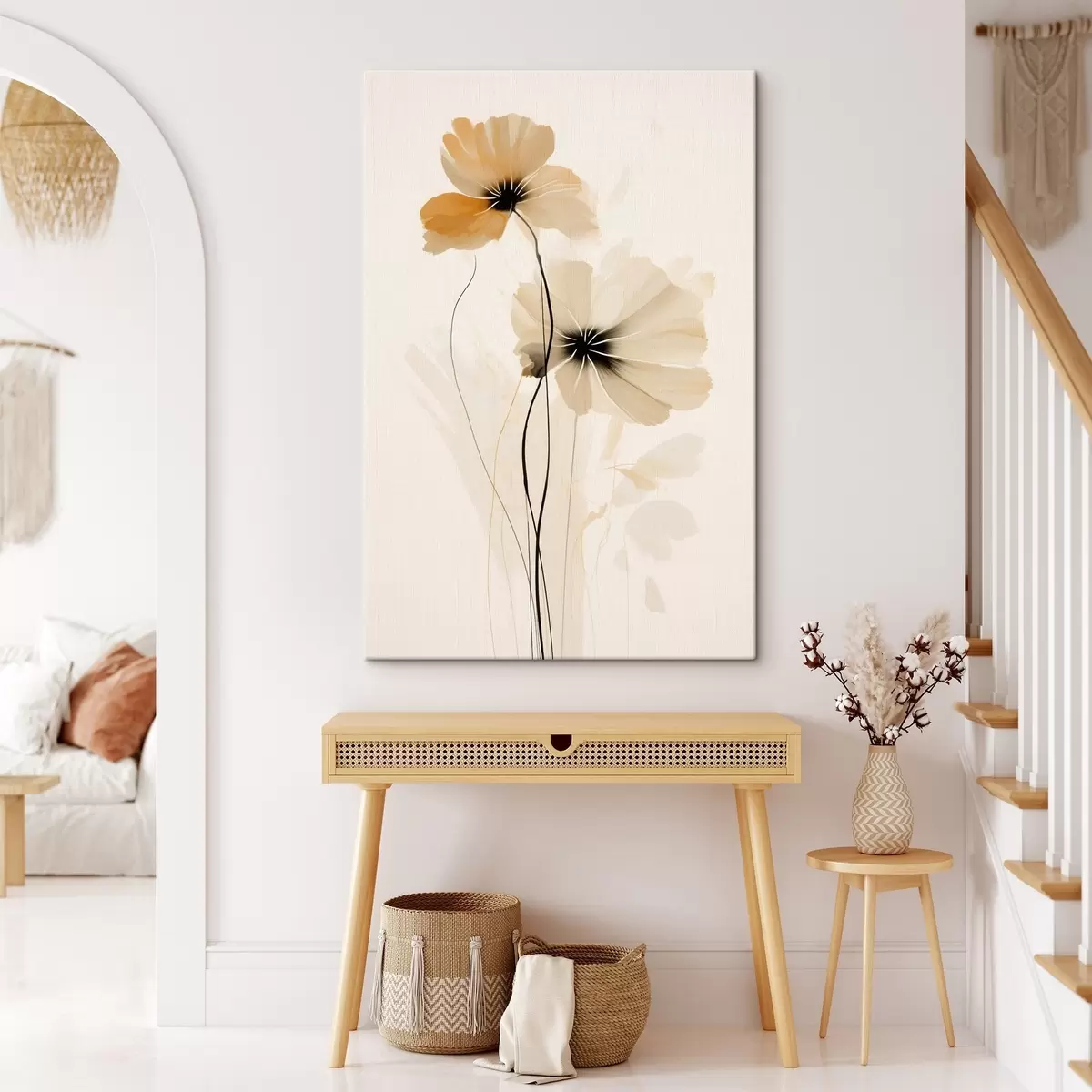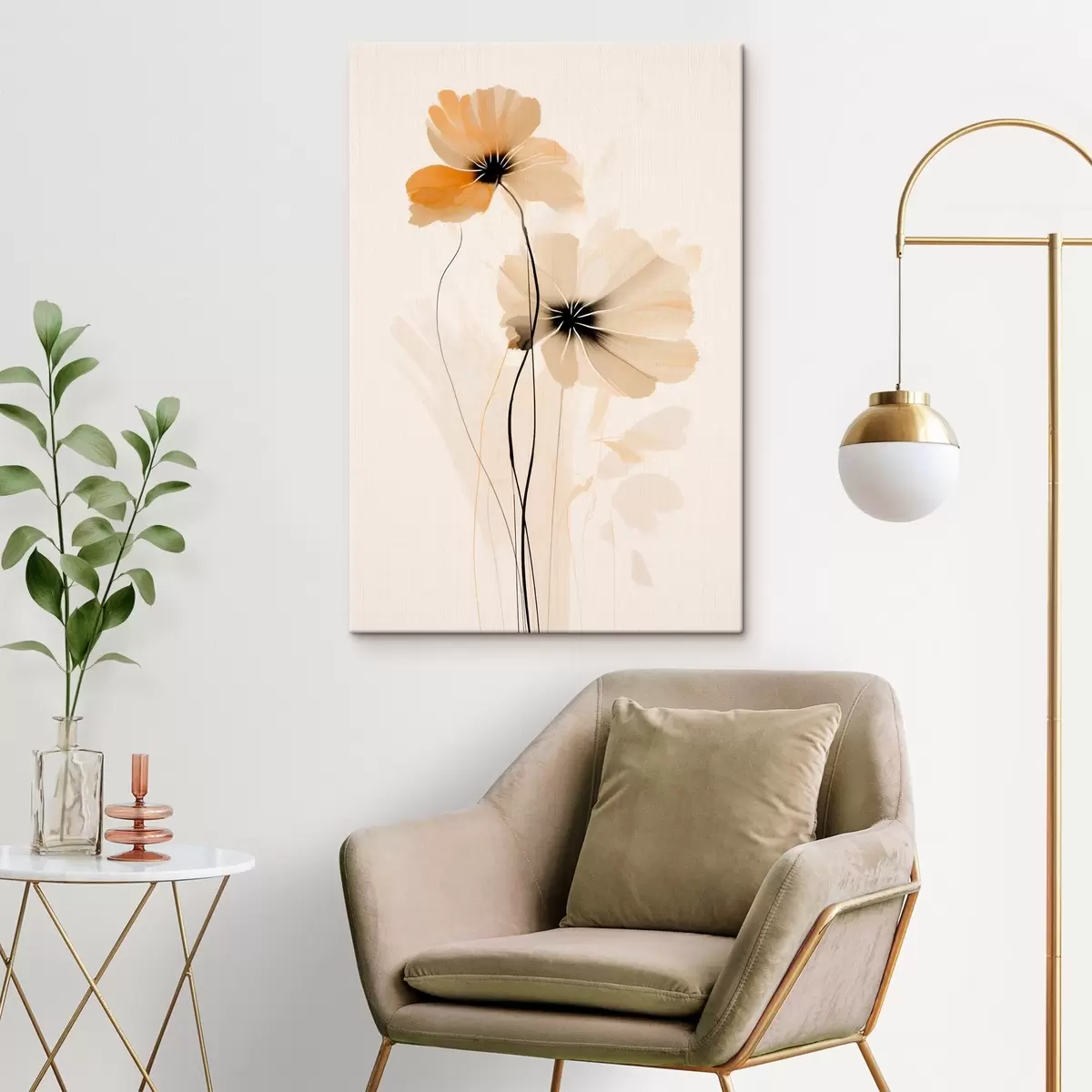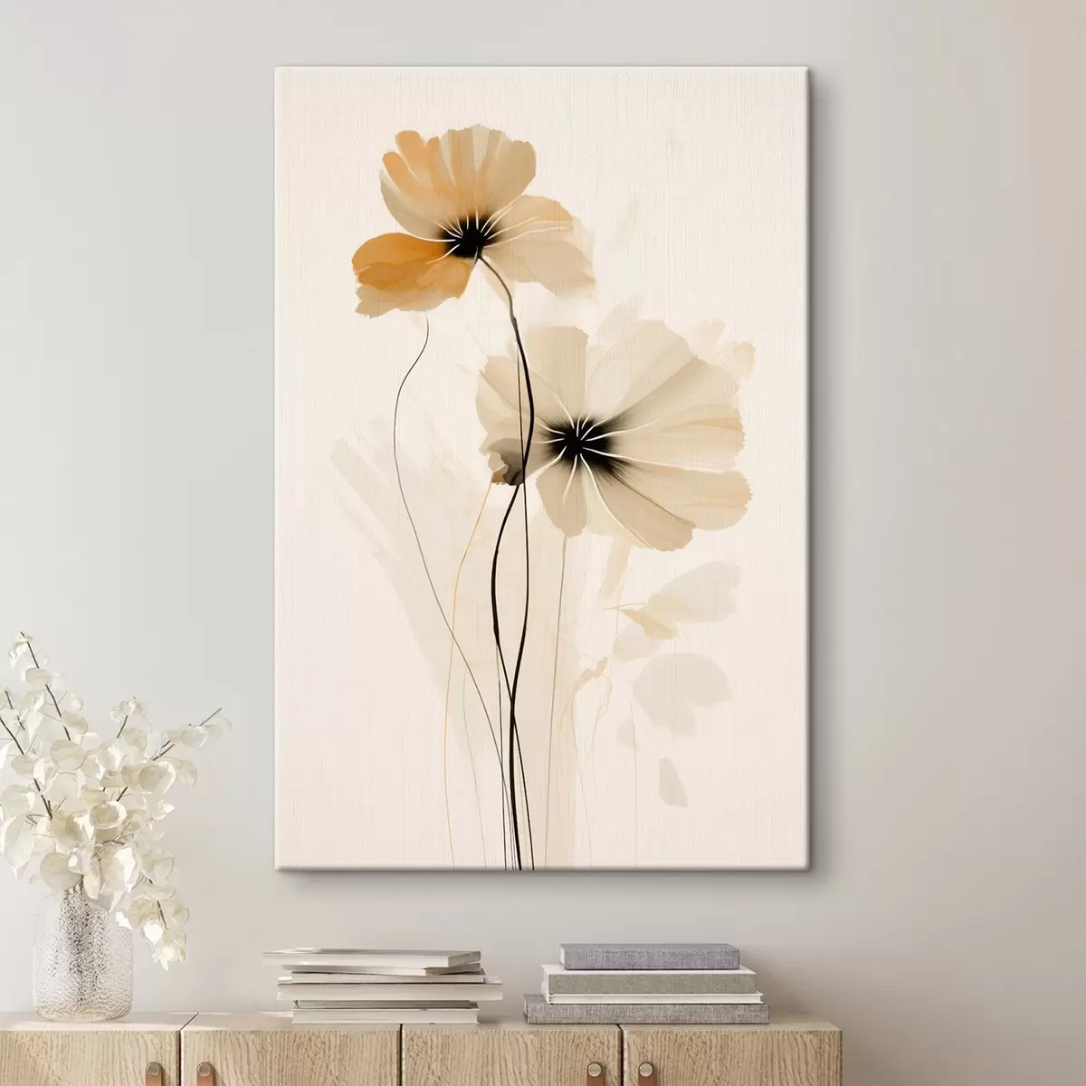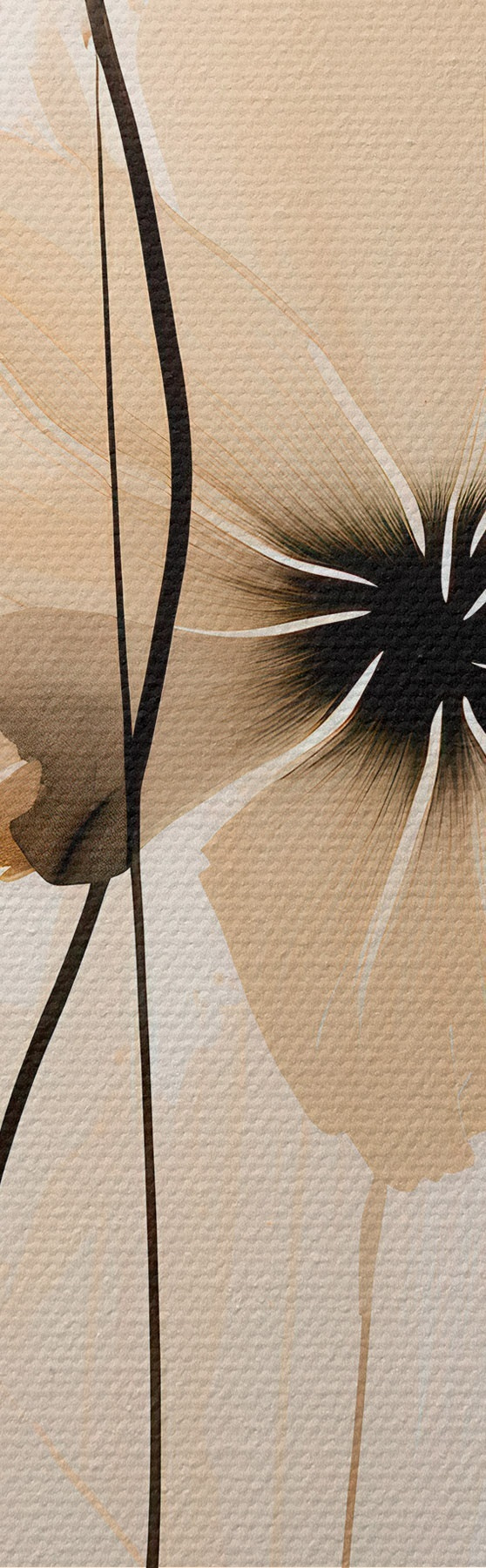 Cuadros Flores en una paleta de colores beige y melocotón con centros oscuros en un estilo minimalista. Nr s46945