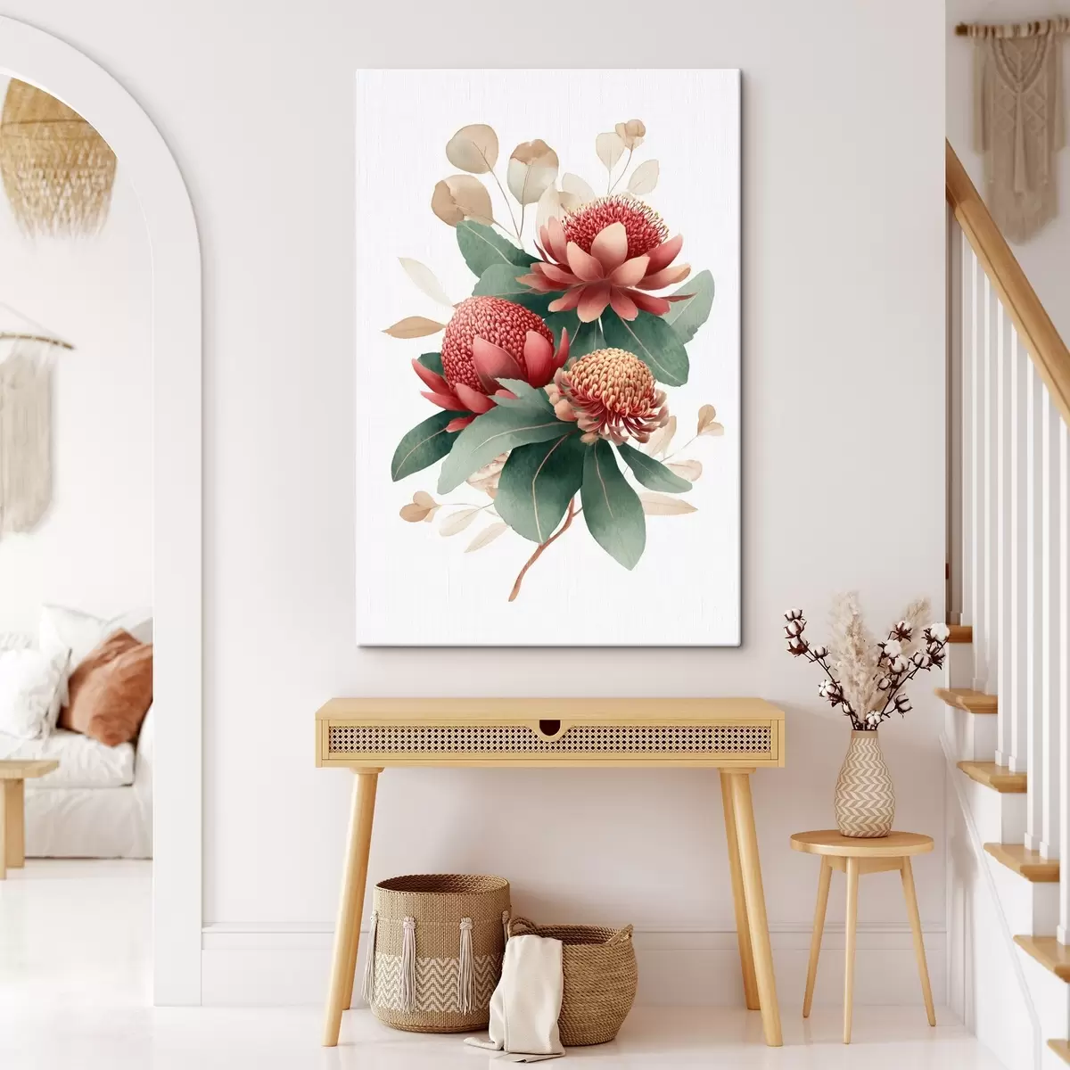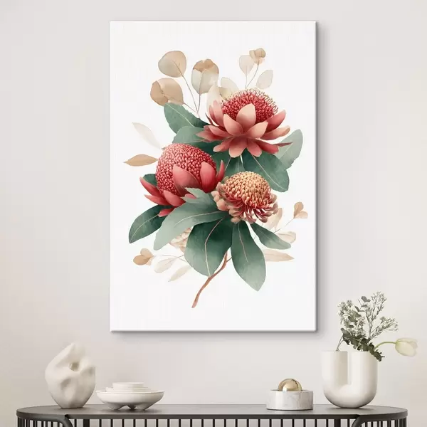Cuadros Composición floral con grandes proteas y eucalipto en un estilo moderno de ilustración digital. Nr s46955