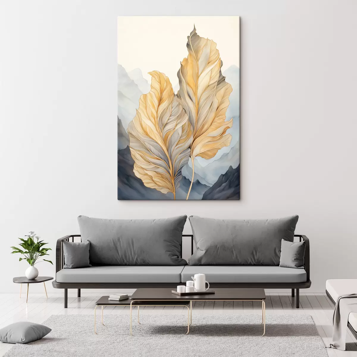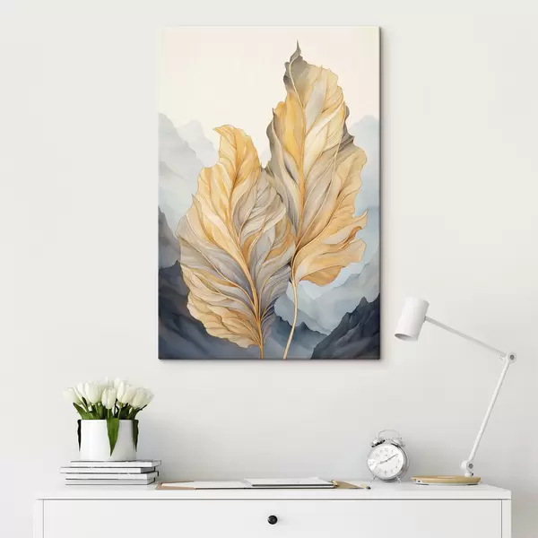 Cuadros Hojas abstractas grandes, amarillas y marrones con detalles intrincados, sobre un paisaje montañoso. Nr s47023
