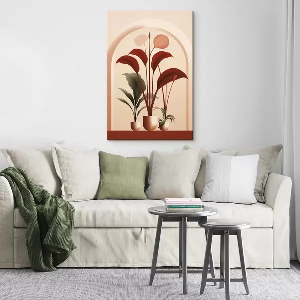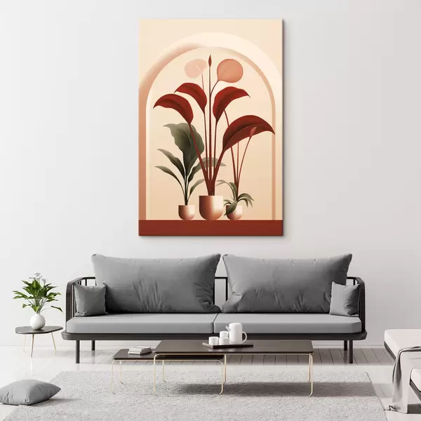 Cuadros Plantas abstractas en macetas con grandes hojas verdes y rojas delante de un arco de color crema. Nr s47033
