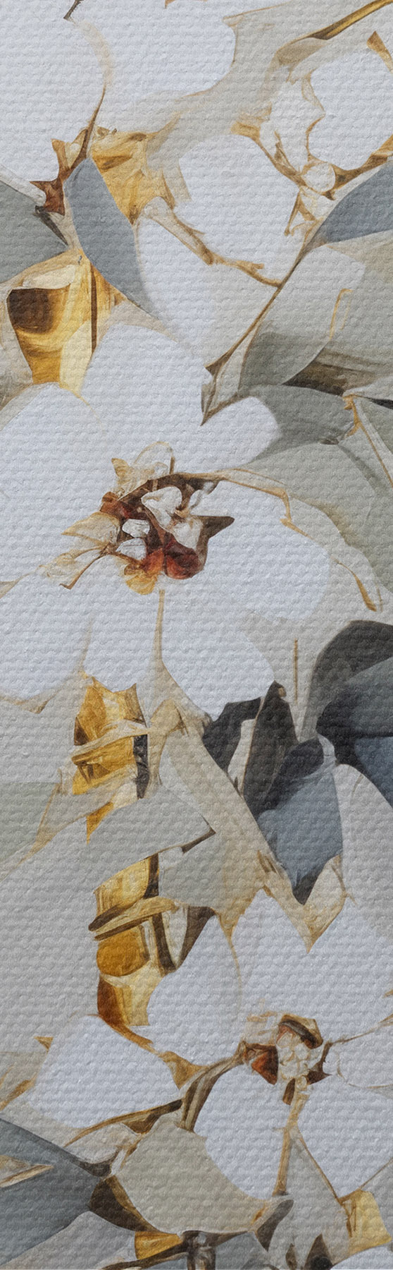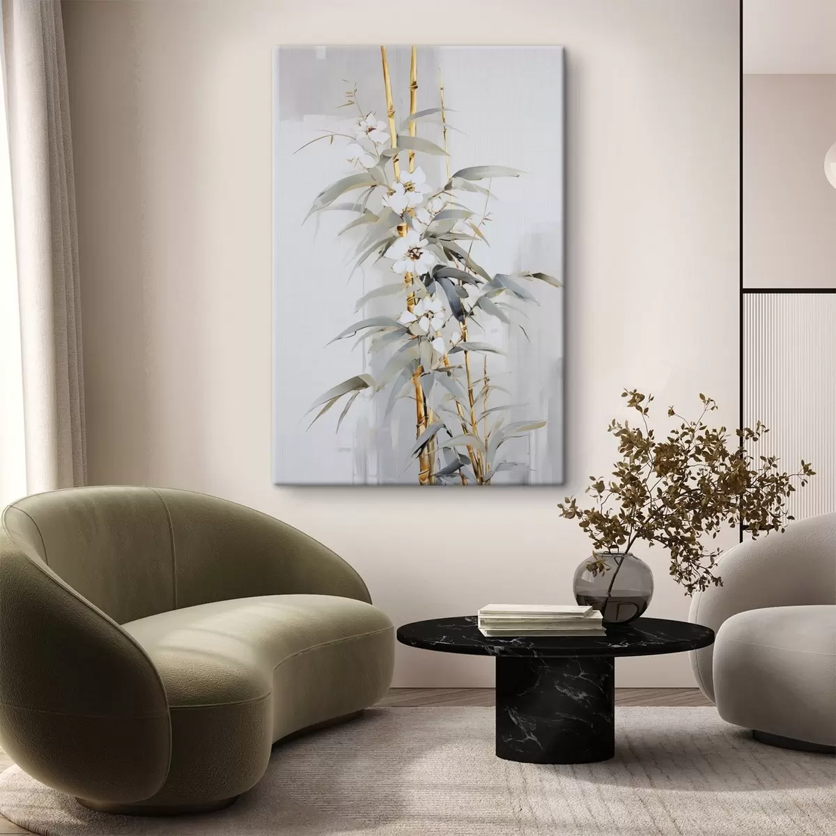 Cuadros Tallos de bambú abstractos con detalles amarillos, delicadas flores blancas y hojas verde pálido, fondo gris. Nr s47039
