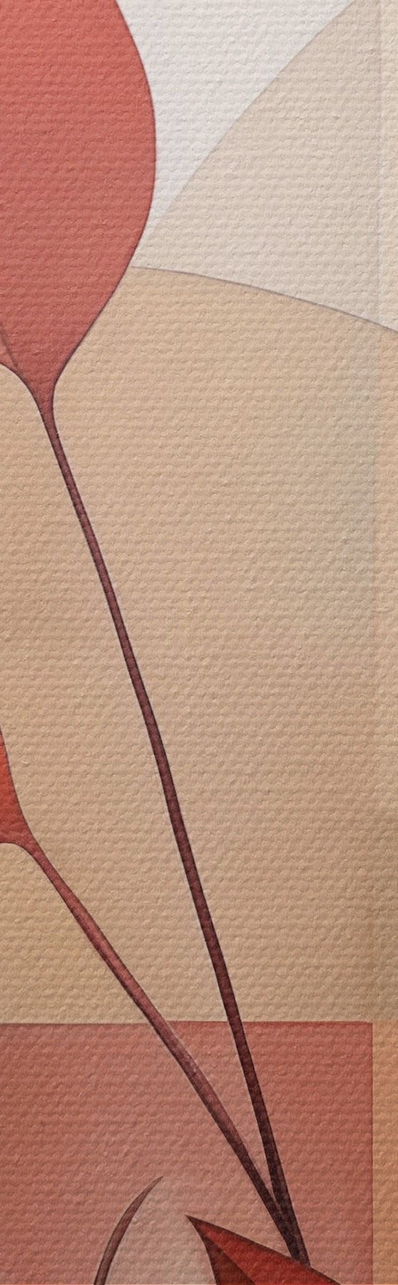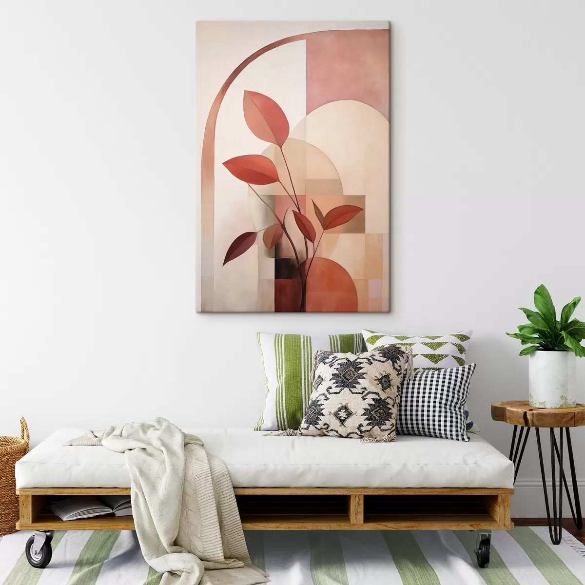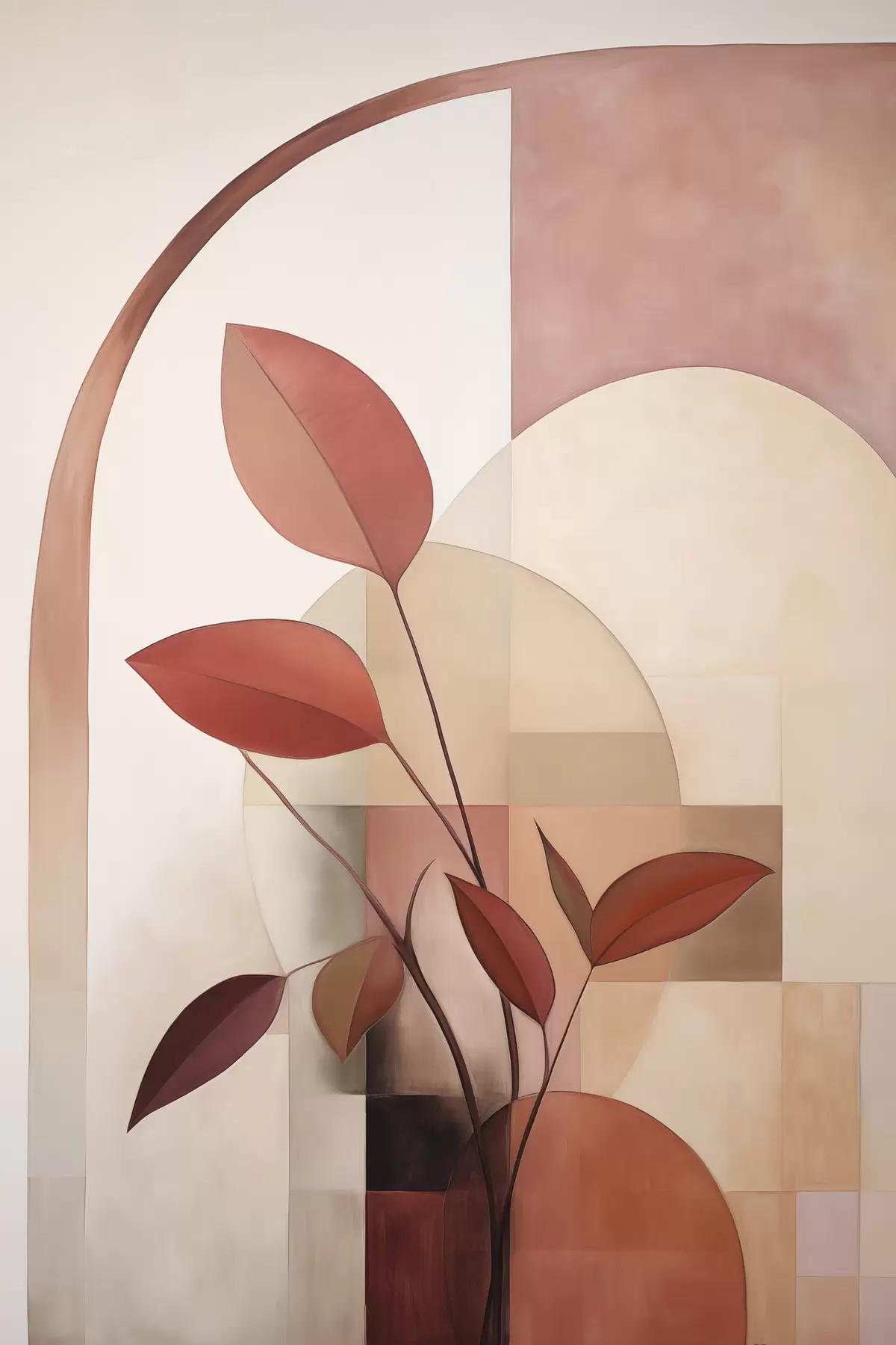 Cuadros Planta abstracta con hojas rojas sobre un fondo de formas geométricas y colores suaves y apagados. Nr s47040
