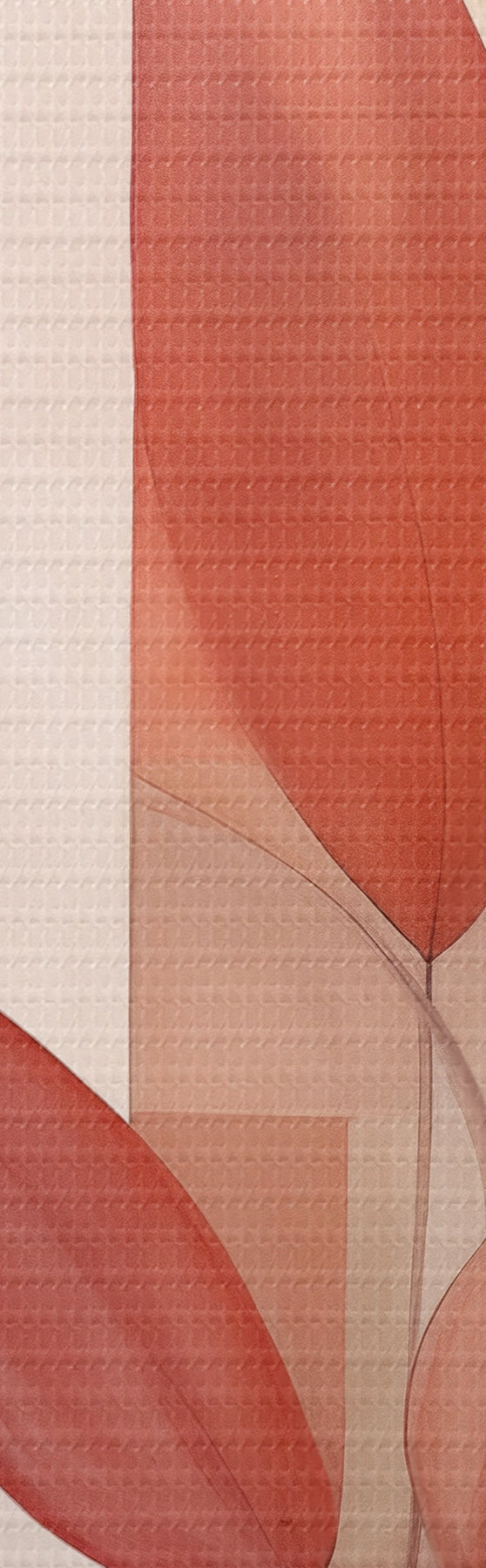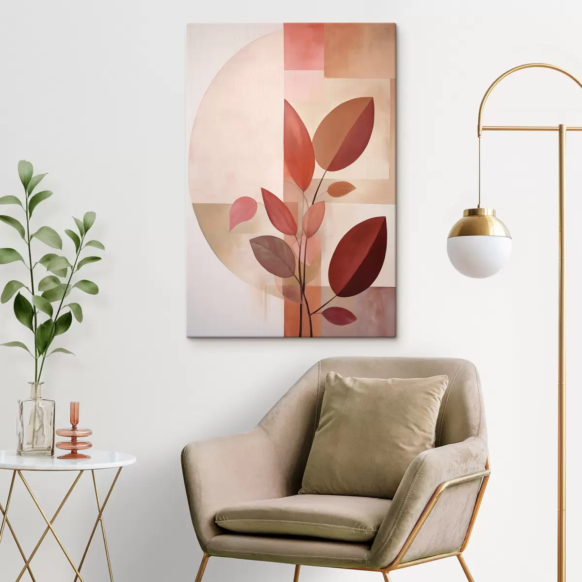 Cuadros Planta abstracta con hojas rojas sobre un fondo de formas geométricas y colores suaves y apagados. Nr s47041