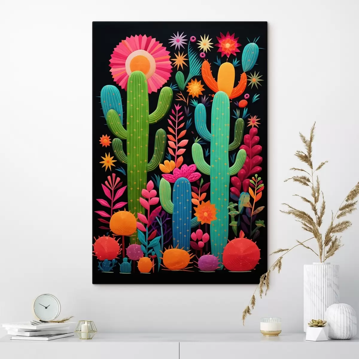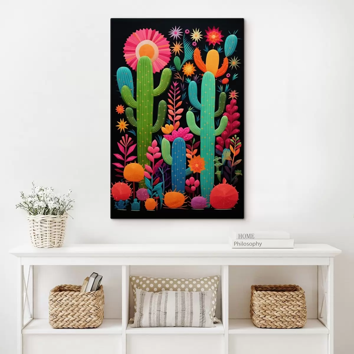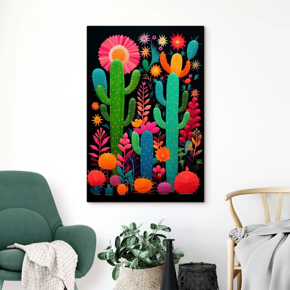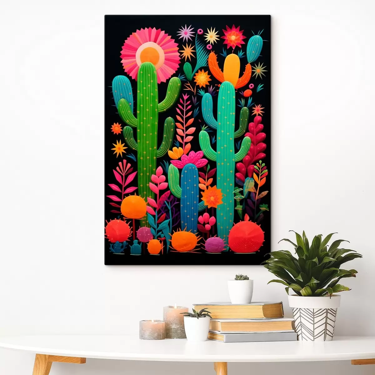 Cuadros Cactus y flores vibrantes sobre fondo oscuro Nr s47297