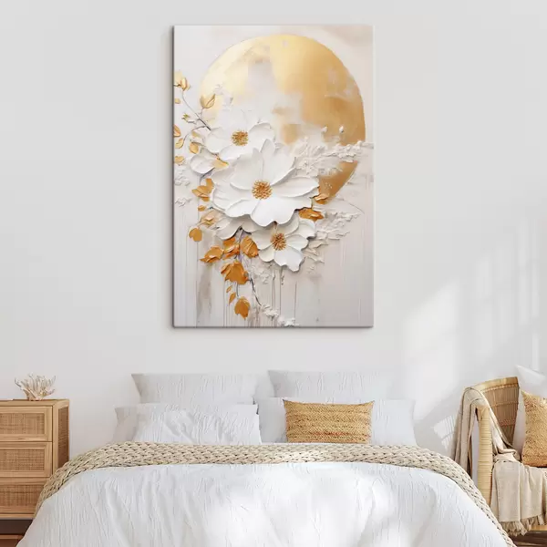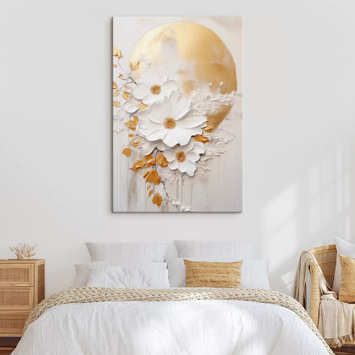 Cuadros Flores blancas con detalles amarillos y hojas delicadas sobre un fondo texturizado, arte moderno. Nr s47414