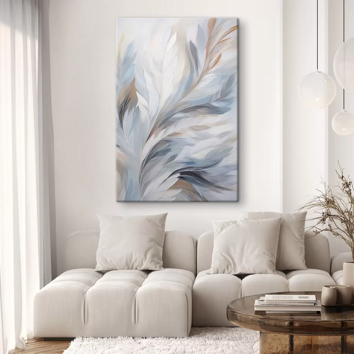 Cuadros Delicadas plumas azul claro y marrón con una textura suave y etérea, sobre un fondo blanco. Nr s47416