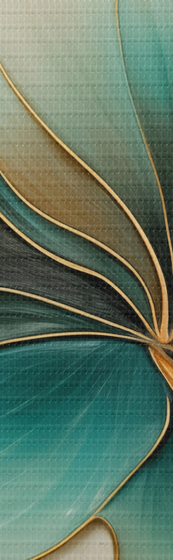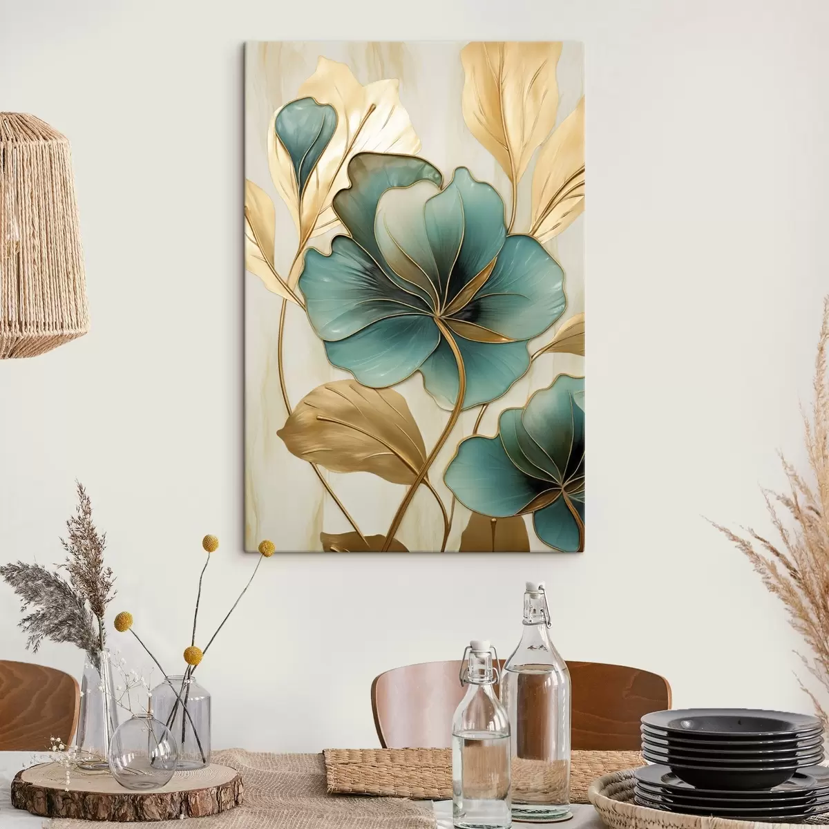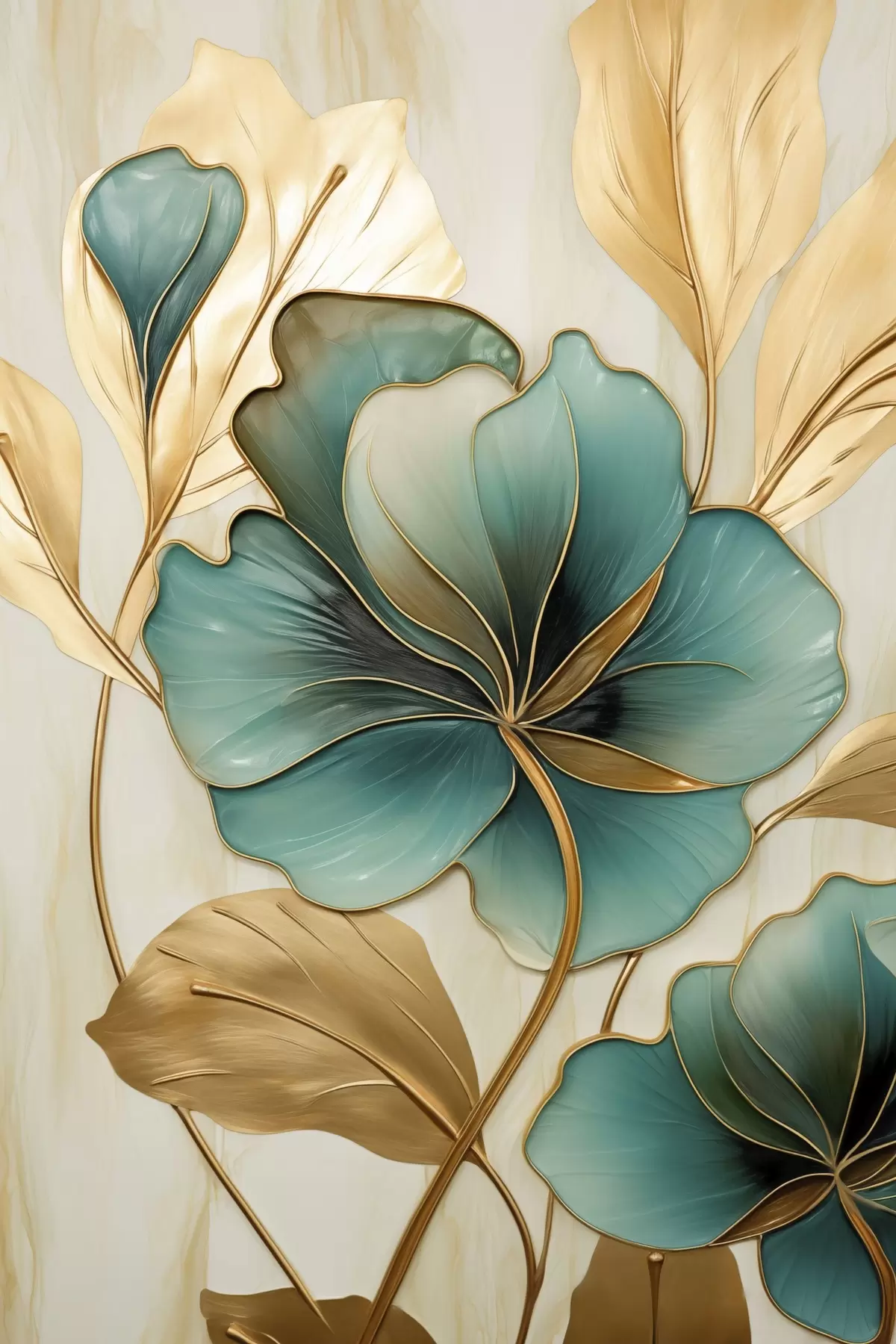 Cuadros Grandes flores verde azuladas y amarillas con contornos, rodeadas de hojas amarillas sobre un fondo abstracto. Nr s47419