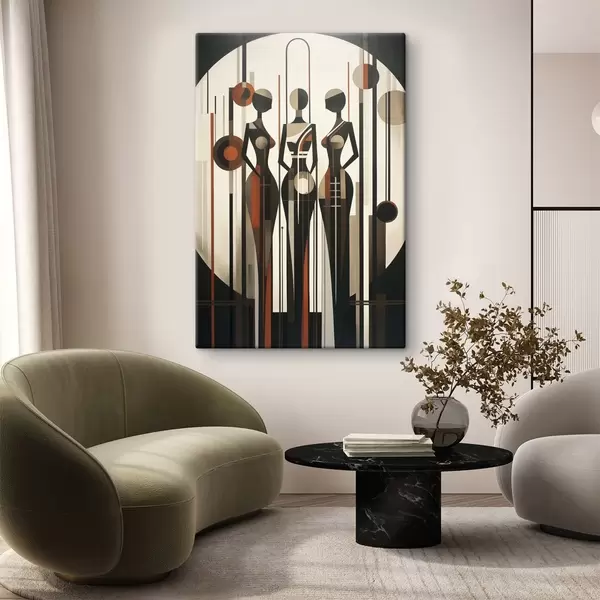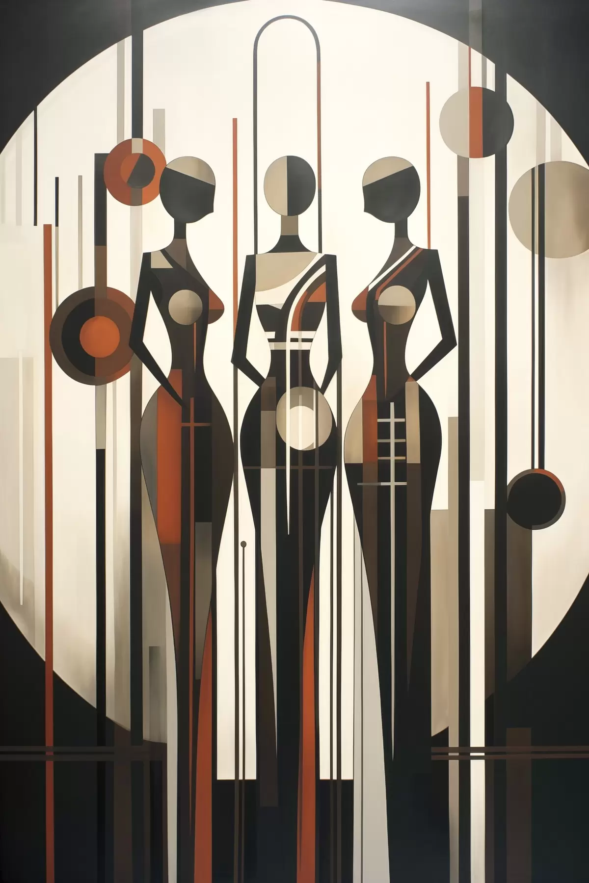 Cuadros Figuras femeninas estilizadas con elementos geométricos sobre un fondo abstracto de líneas verticales y círculos. Nr s47422