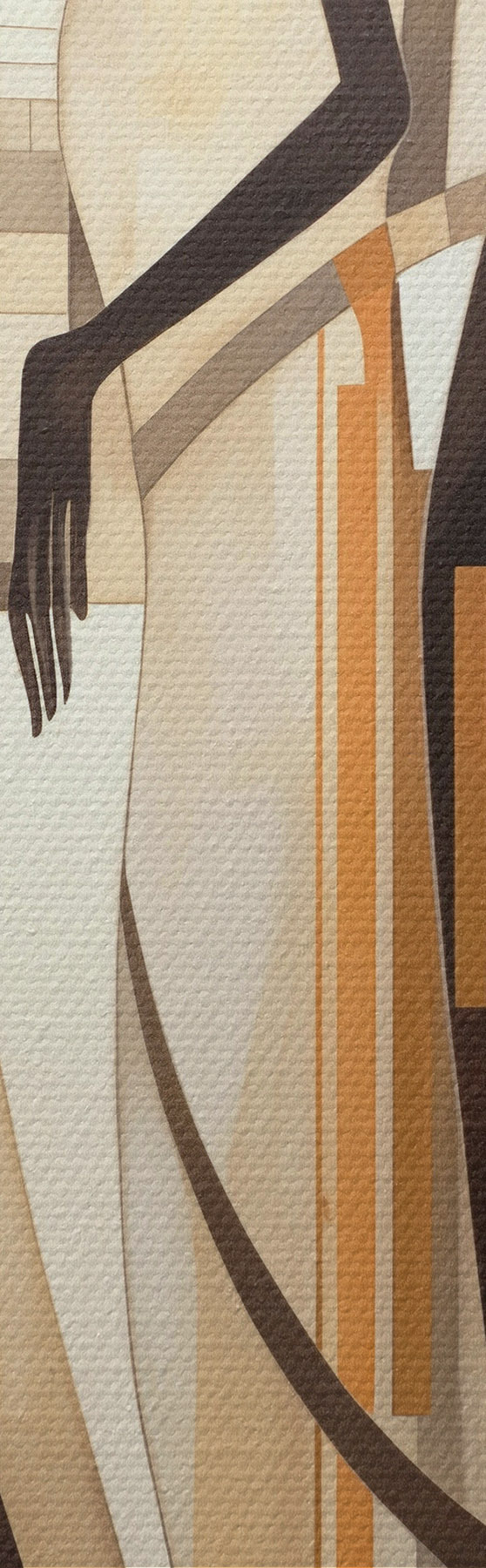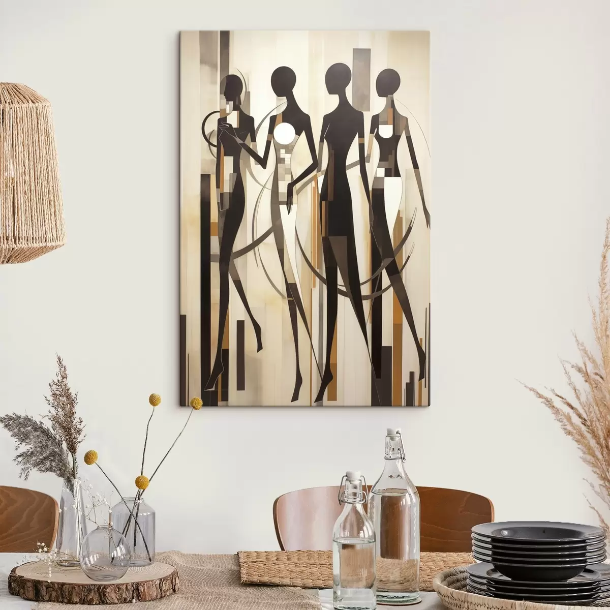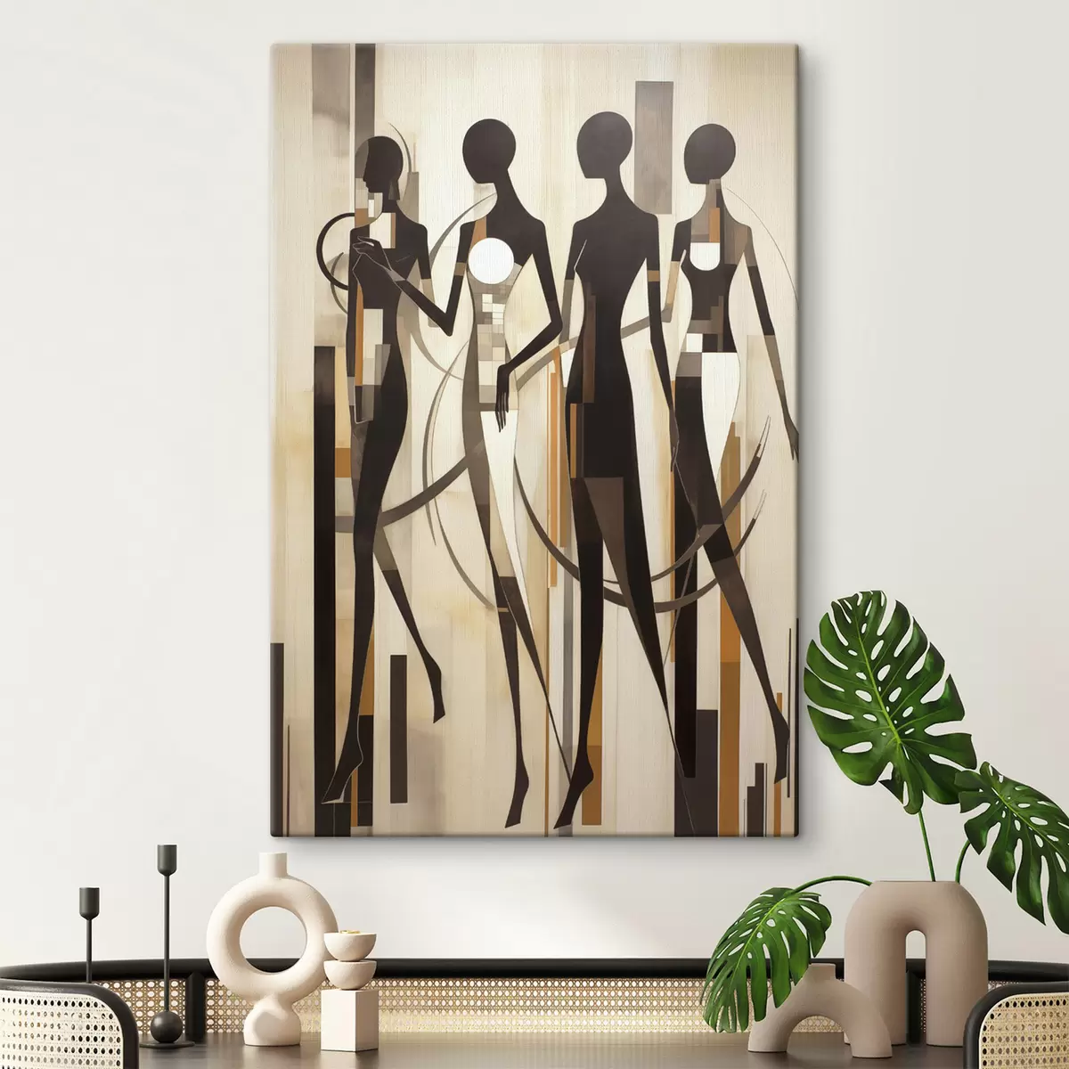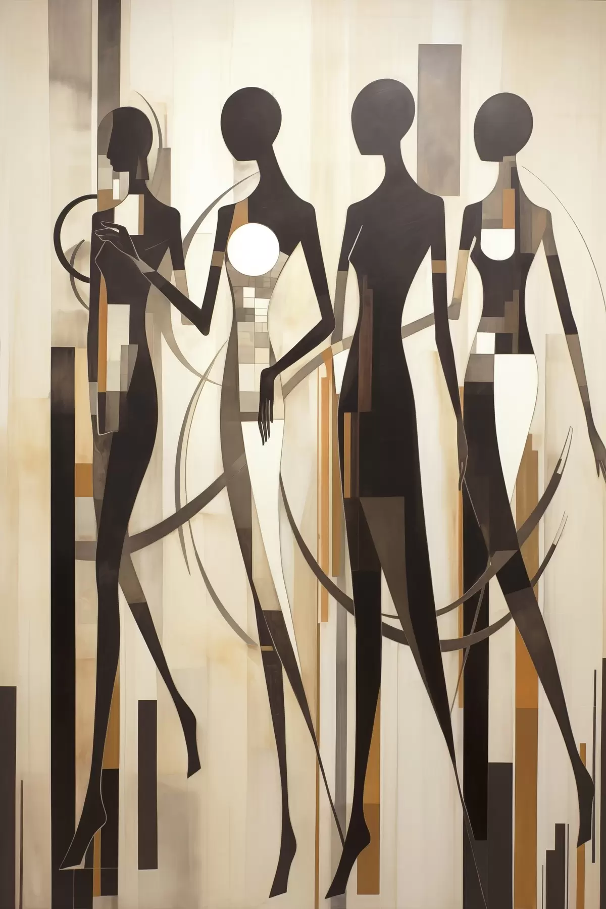 Cuadros Figuras femeninas estilizadas con elementos geométricos sobre un fondo abstracto de líneas verticales. Nr s47423