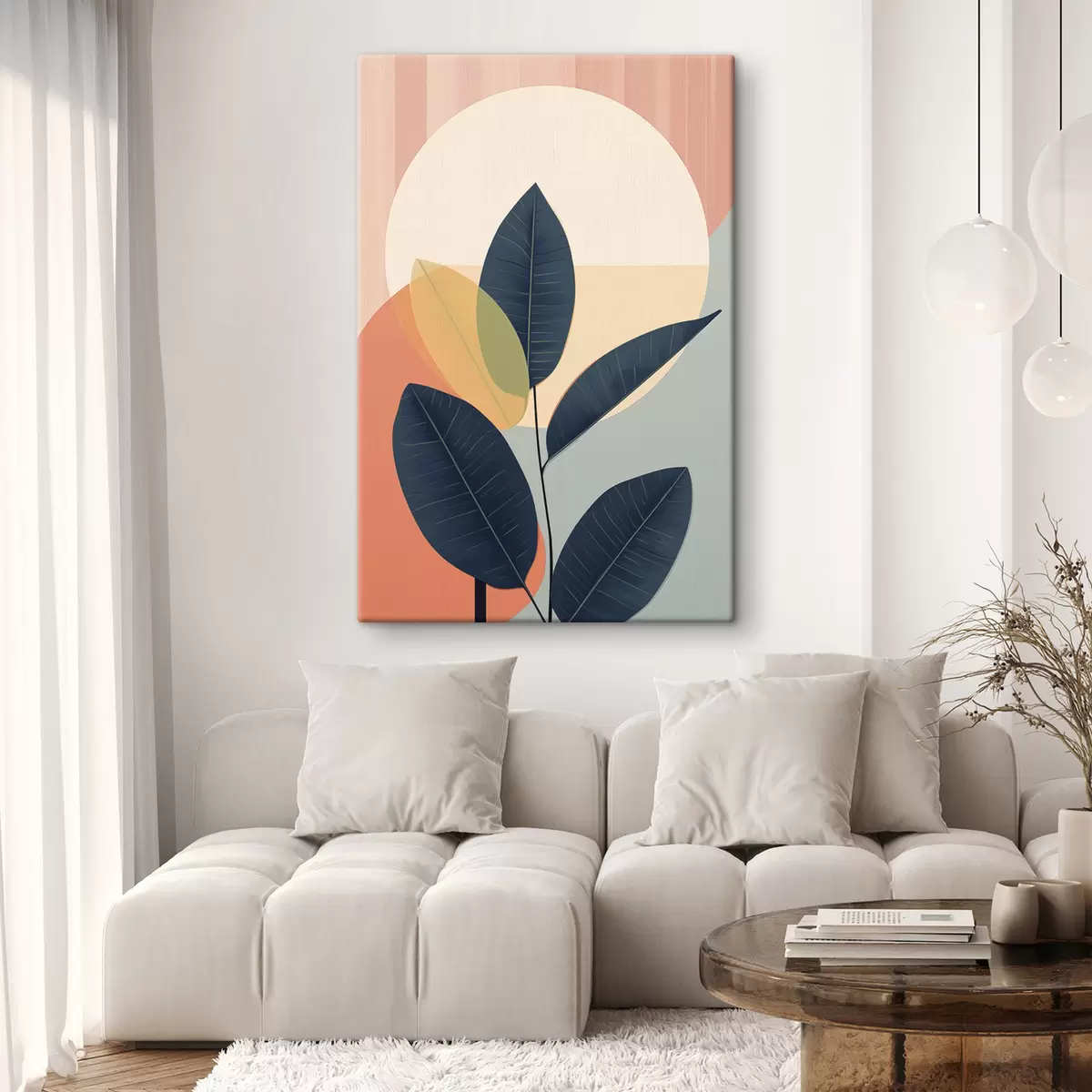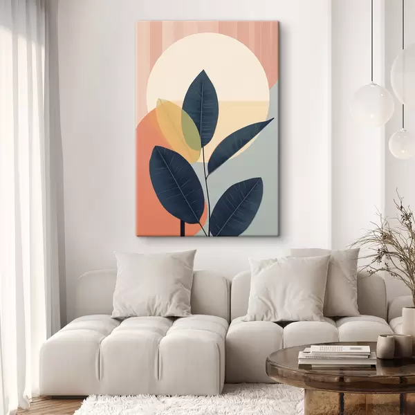 Cuadros Hojas oscuras sobre un fondo de formas abstractas en tonos melocotón y gris con un gran círculo amarillo pálido. Nr s47424