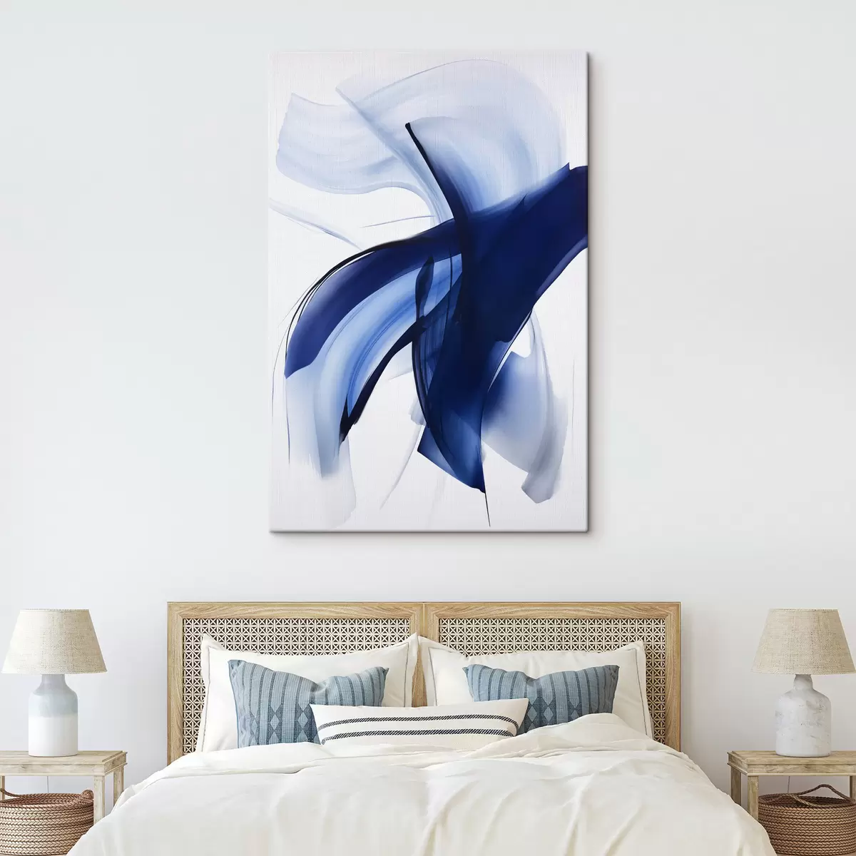Cuadros Formas abstractas azules similares a pinceladas con líneas y curvas fluidas sobre un fondo blanco, arte moderno. Nr s47429