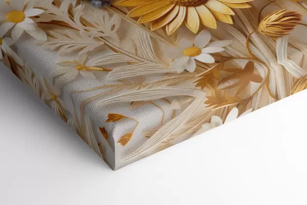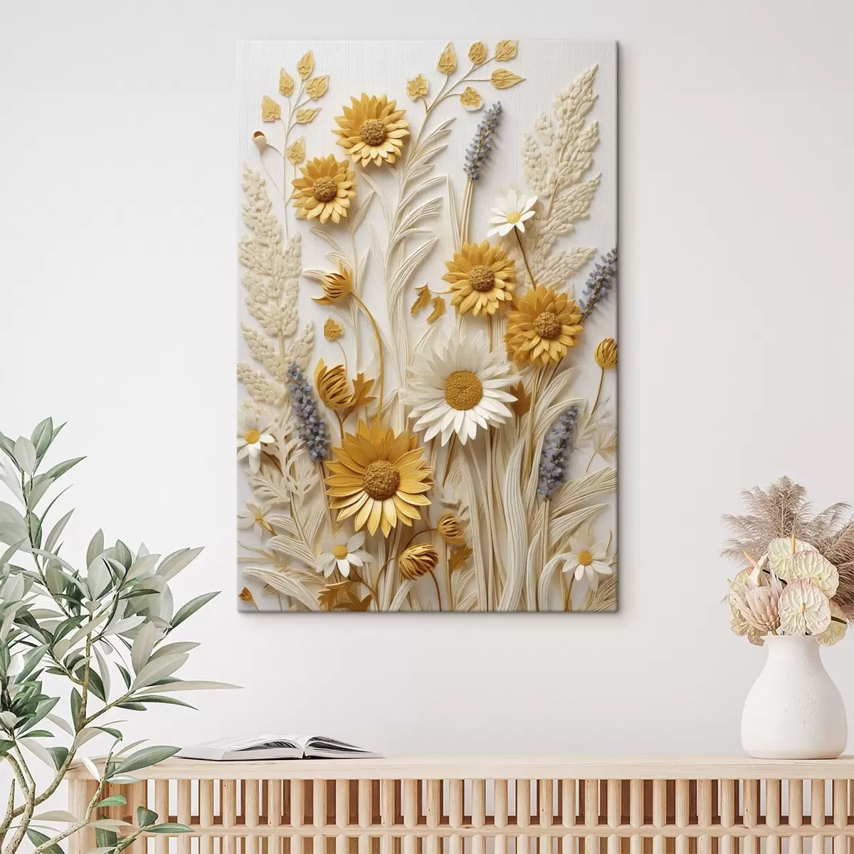 Cuadros Una colección texturizada de margaritas amarillas y blancas con hierbas secas y ramitas de lavanda sobre un fondo blanco. Nr s47430