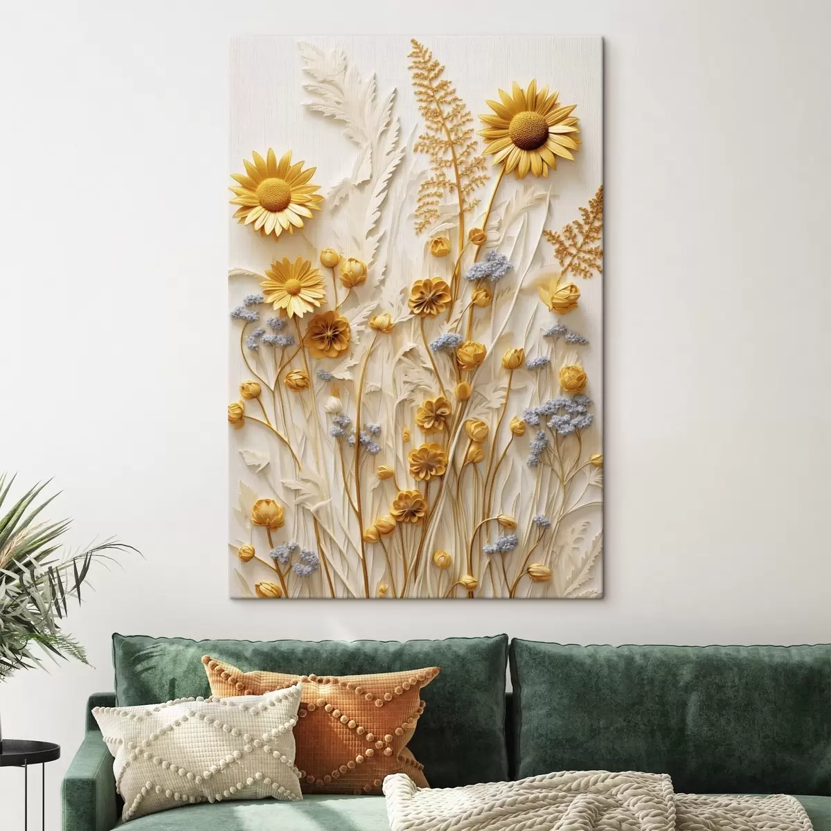 Cuadros Una colección texturizada de margaritas amarillas y blancas con hierbas secas y ramitas de lavanda sobre un fondo blanco. Nr s47431