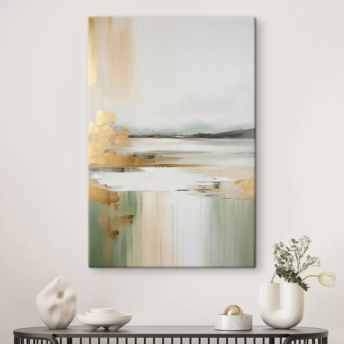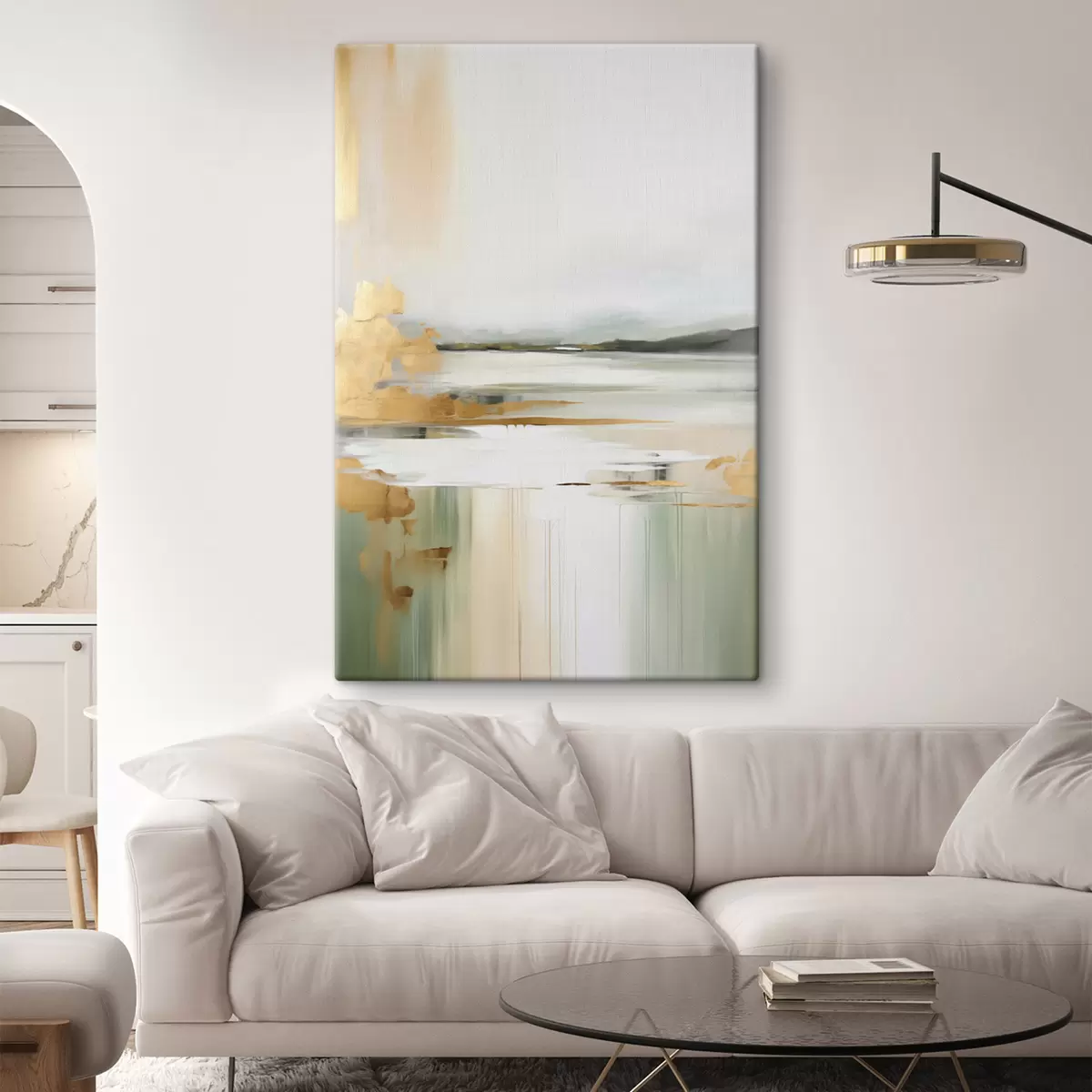 Cuadros Paisaje abstracto con tonos amarillos y verdes, agua que refleja el cielo y montañas lejanas, cielo pálido y brumoso. Nr s47438