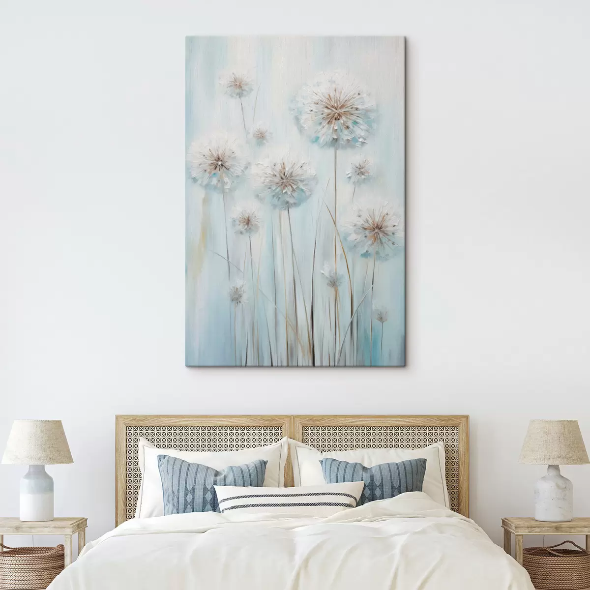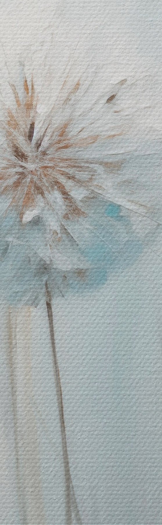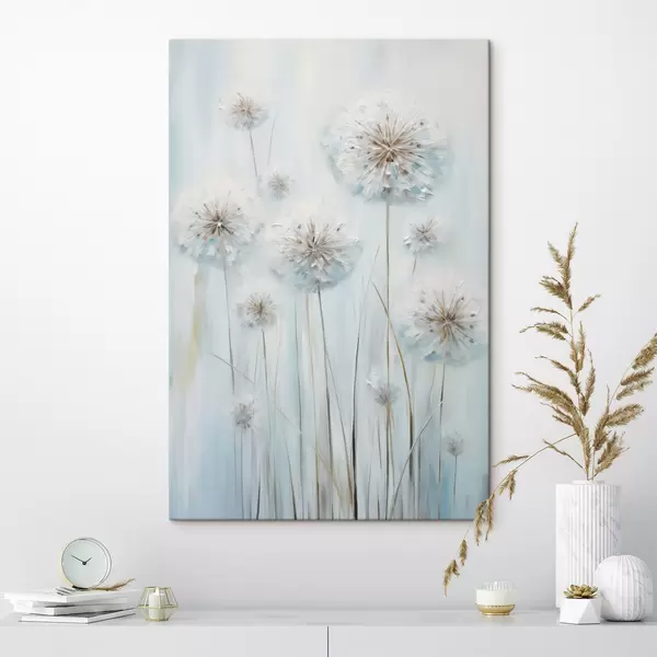 Cuadros Estilo pictórico texturizado de dientes de león sobre un fondo azul y blanco suave. Nr s47856