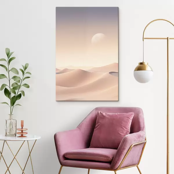 Cuadros Un paisaje desértico con dunas onduladas bajo un cielo de suaves tonos pastel, con montañas lejanas al fondo. Nr s47866