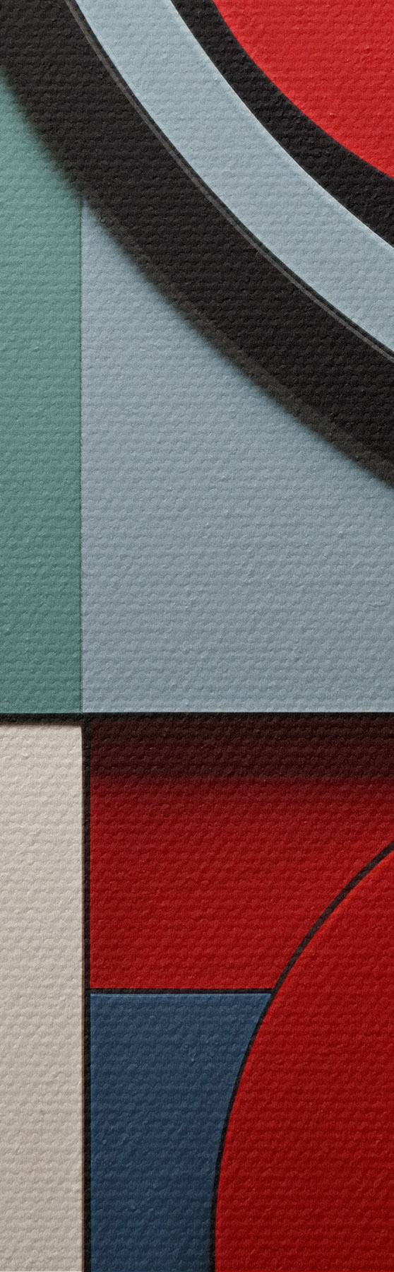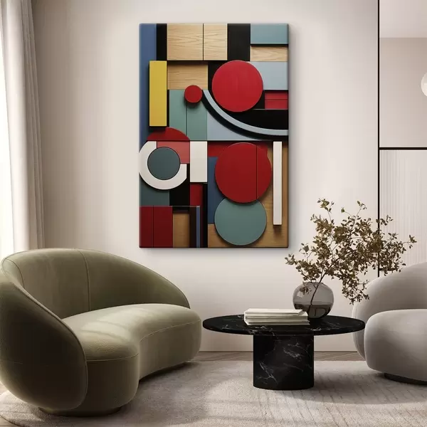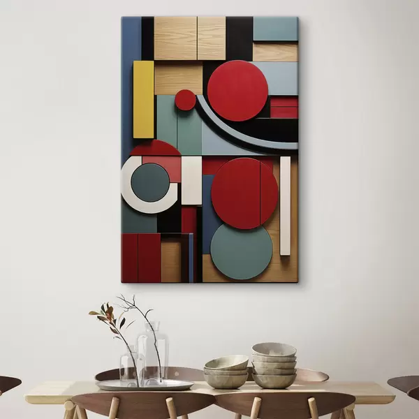 Cuadros Composición geométrica abstracta con imitación de textura de madera, rectángulos y círculos rojos, negros, blancos y verde azulado. Nr s47876