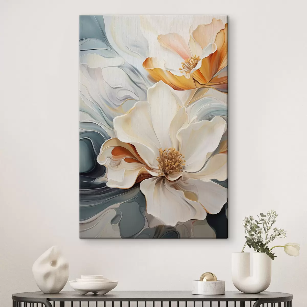 Cuadros Flor abstracta grande con pétalos blancos, naranjas y verde azulado, fondo texturizado. Nr s47878