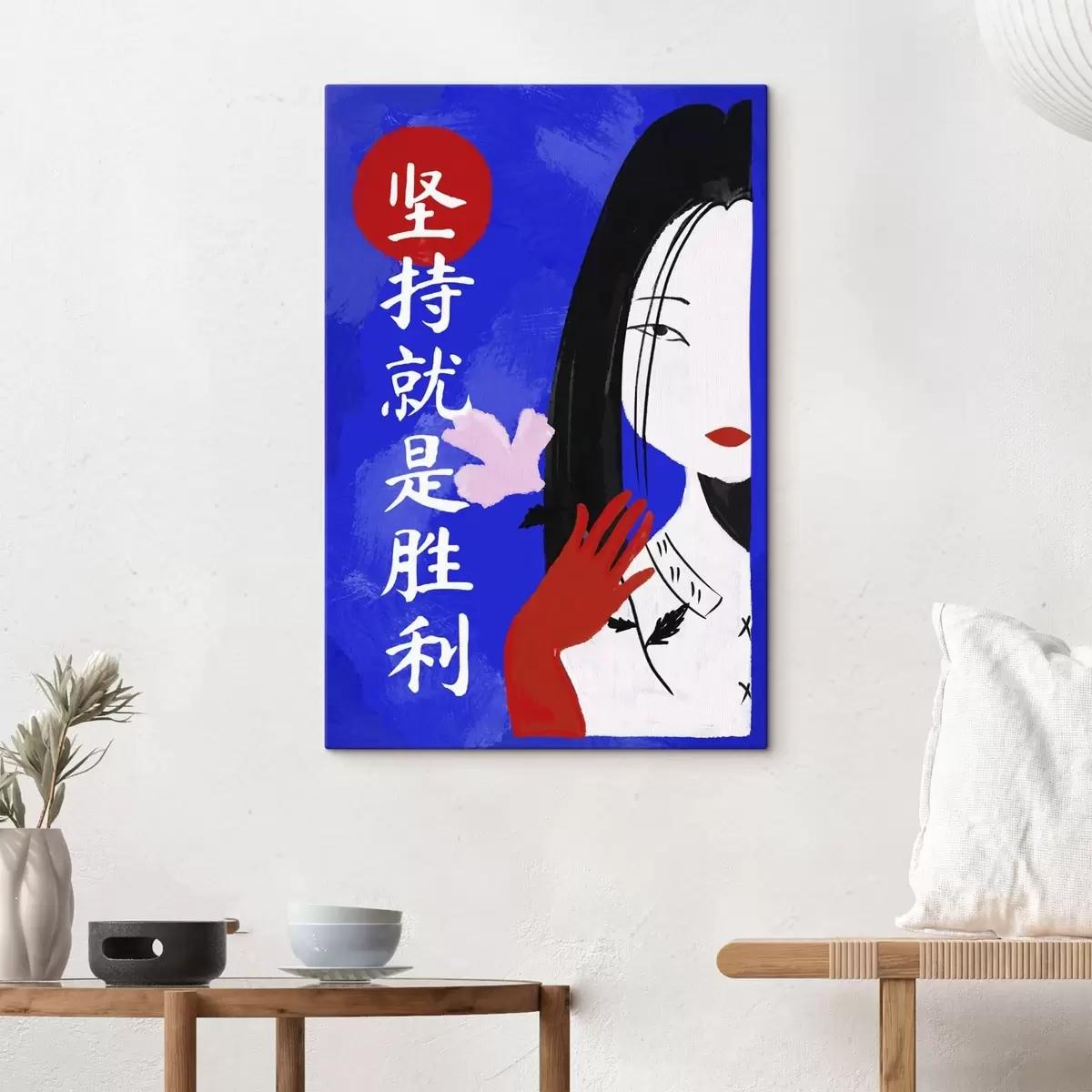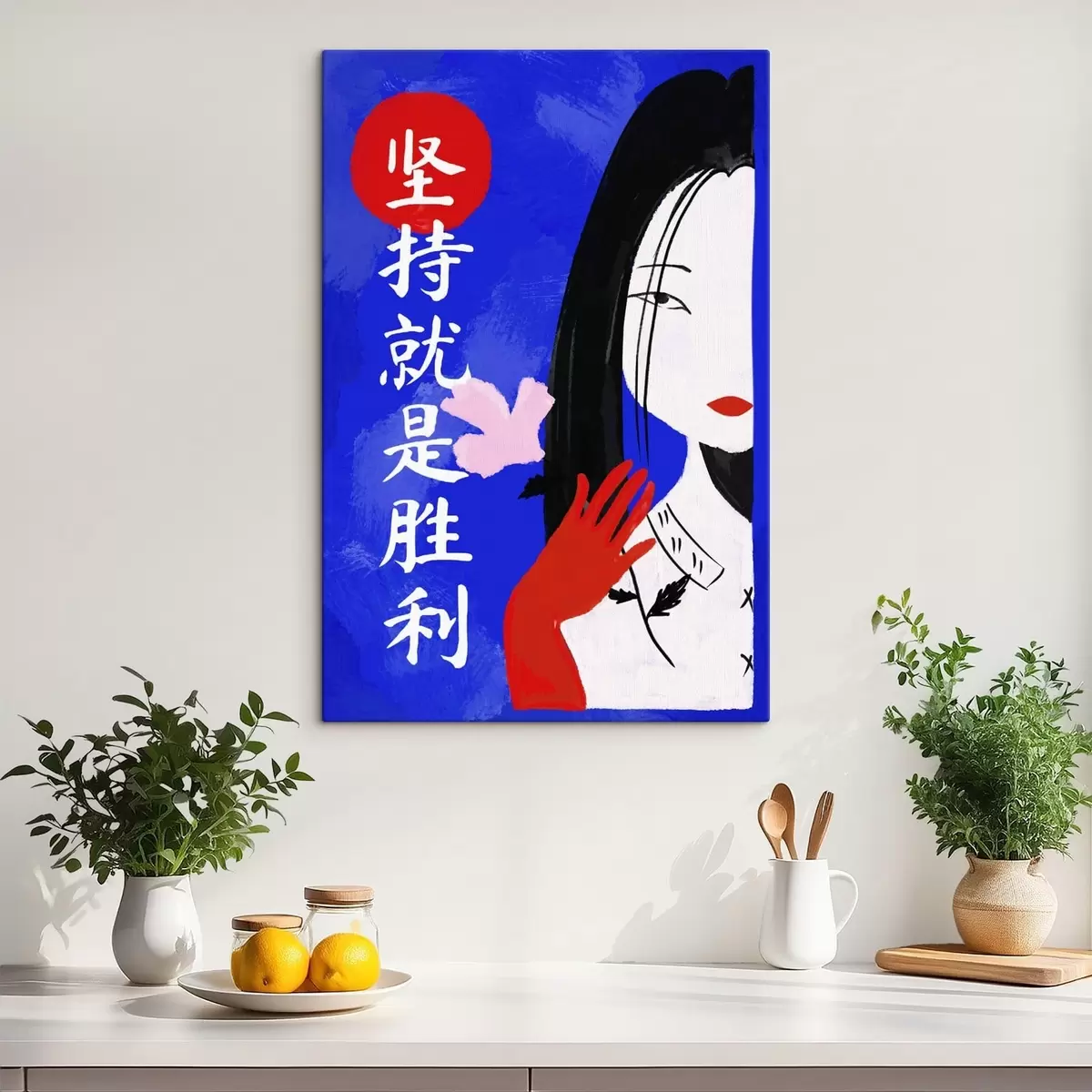 Cuadros Retrato estilizado de una mujer con fondo azul y texto Nr s48032