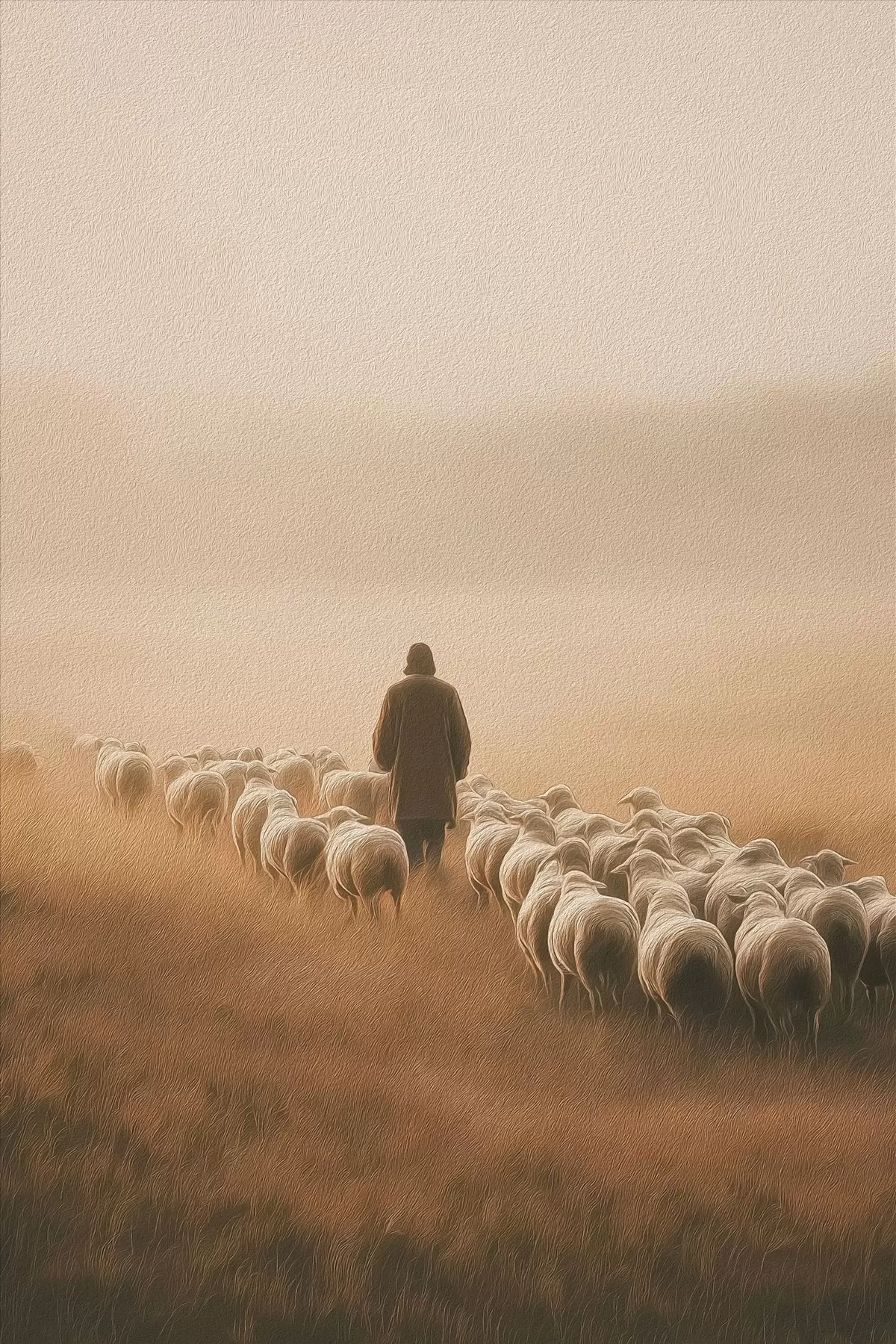 Cuadros Pastor caminando con un rebaño de ovejas en campo abierto. Nr s48077