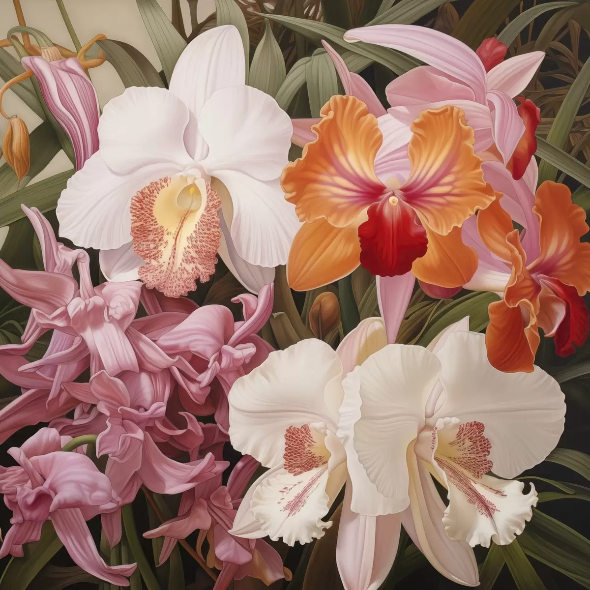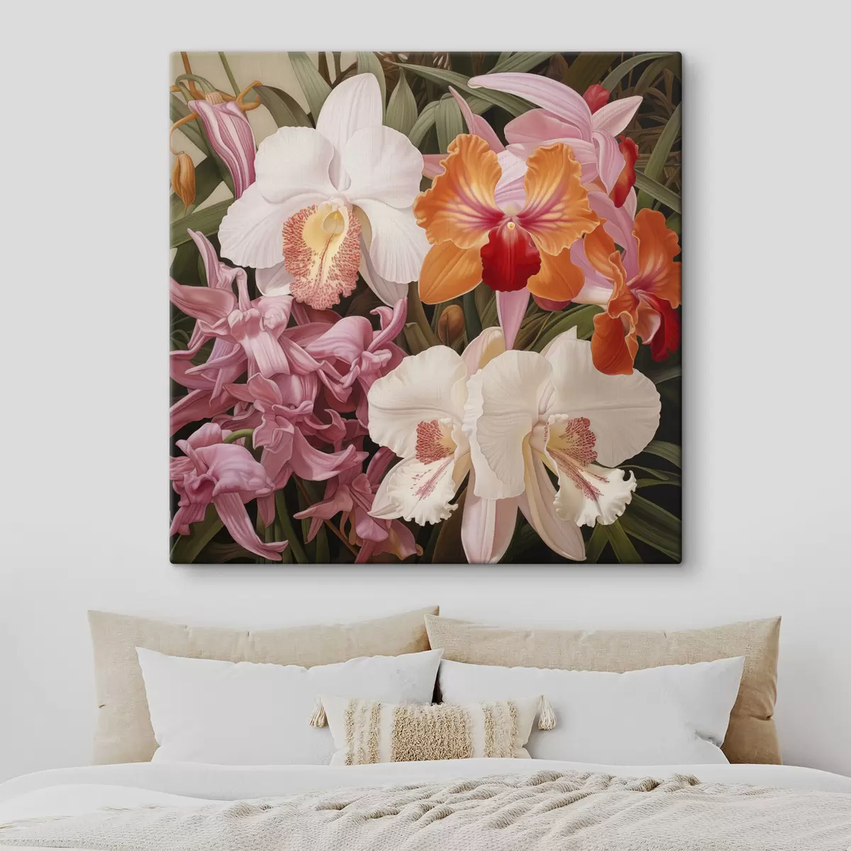 Cuadros Ramo de flores tropicales, con orquídeas y follaje verde al fondo Nr s48385