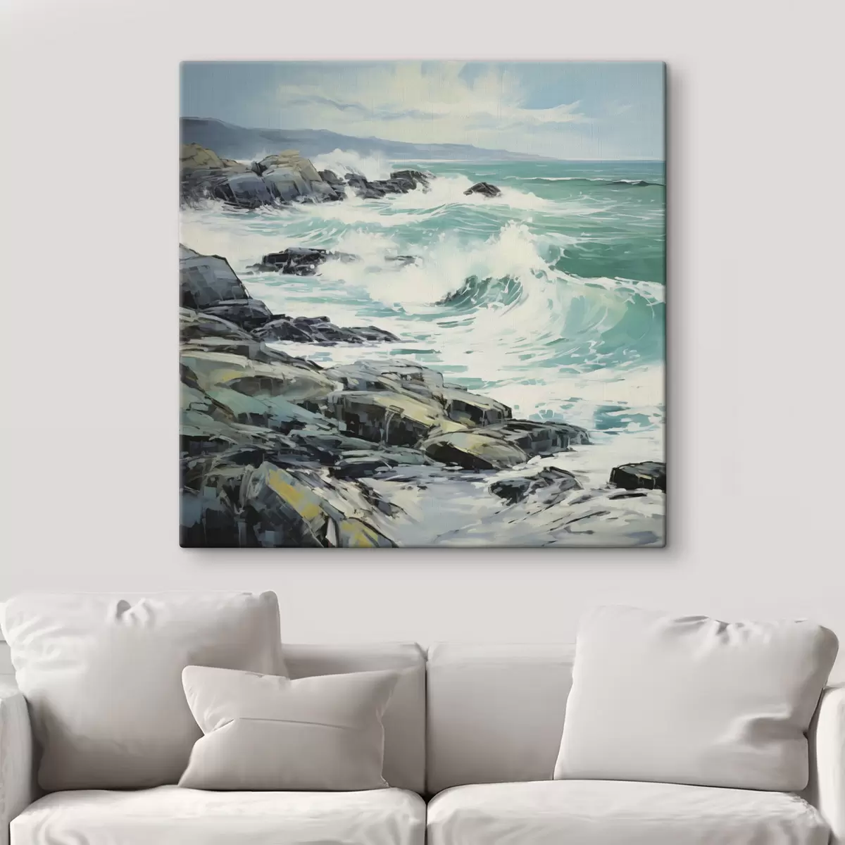 Cuadros Un paisaje de costa rocosa con olas bajo un cielo nublado, estilo pictórico Nr s48388