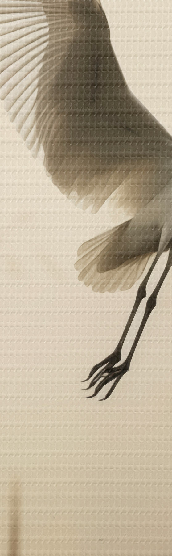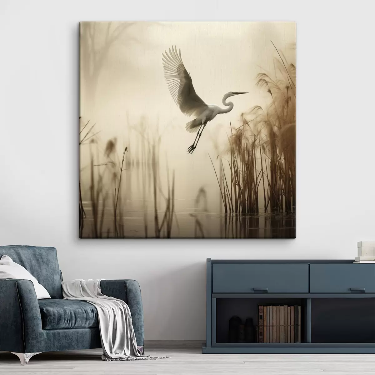 Cuadros Una garza blanca sobrevuela un lago, rodeada de altos juncos y árboles al fondo Nr s48389
