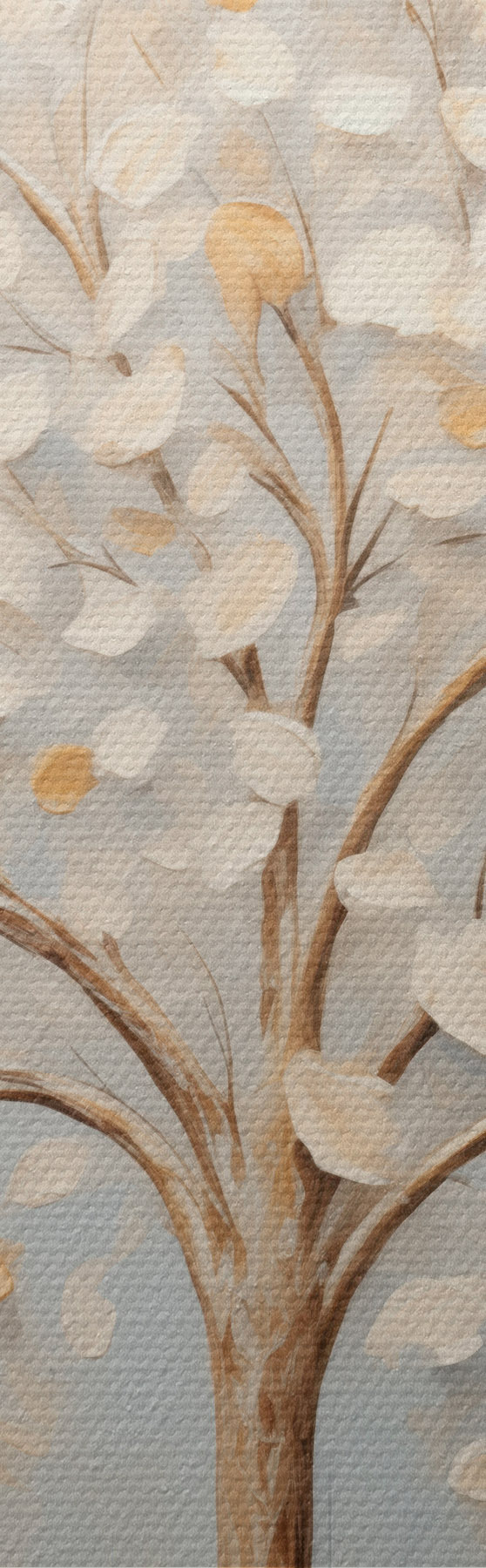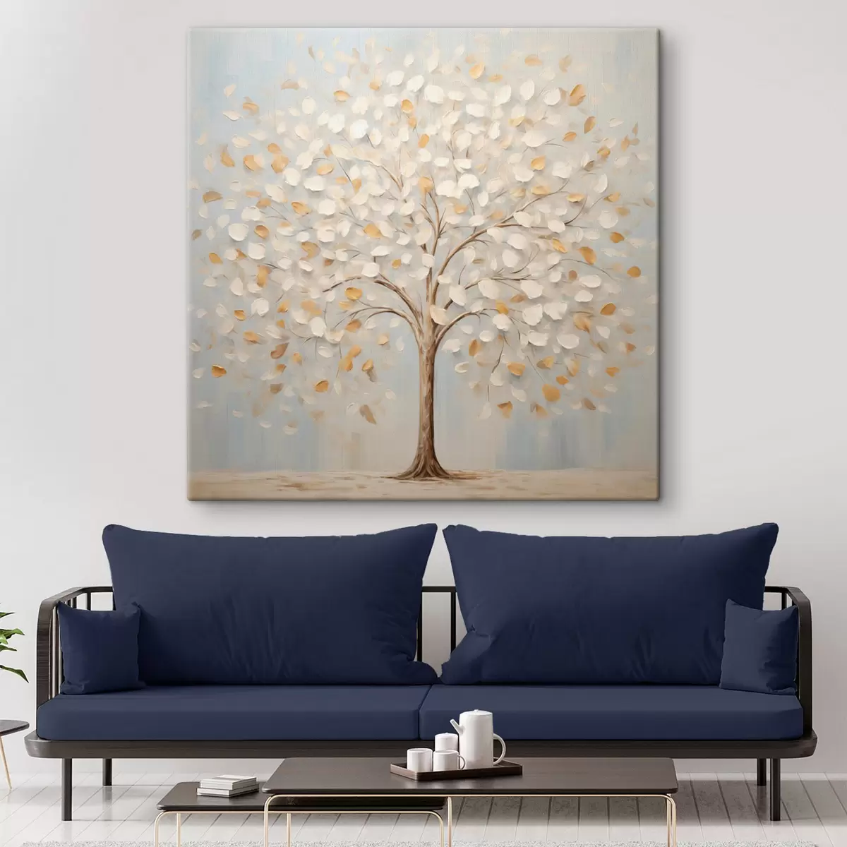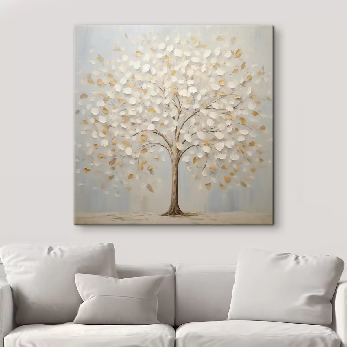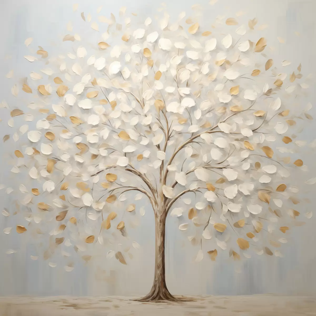 Cuadros Una pintura con textura que representa un árbol con hojas blancas y amarillas sobre un fondo azul claro Nr s48391