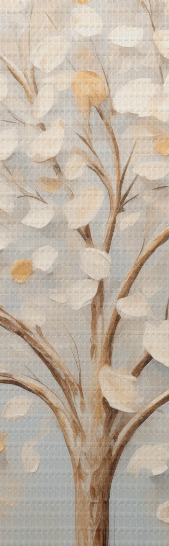 murales de pared Una pintura con textura que representa un árbol con hojas blancas y amarillas sobre un fondo azul claro s48391