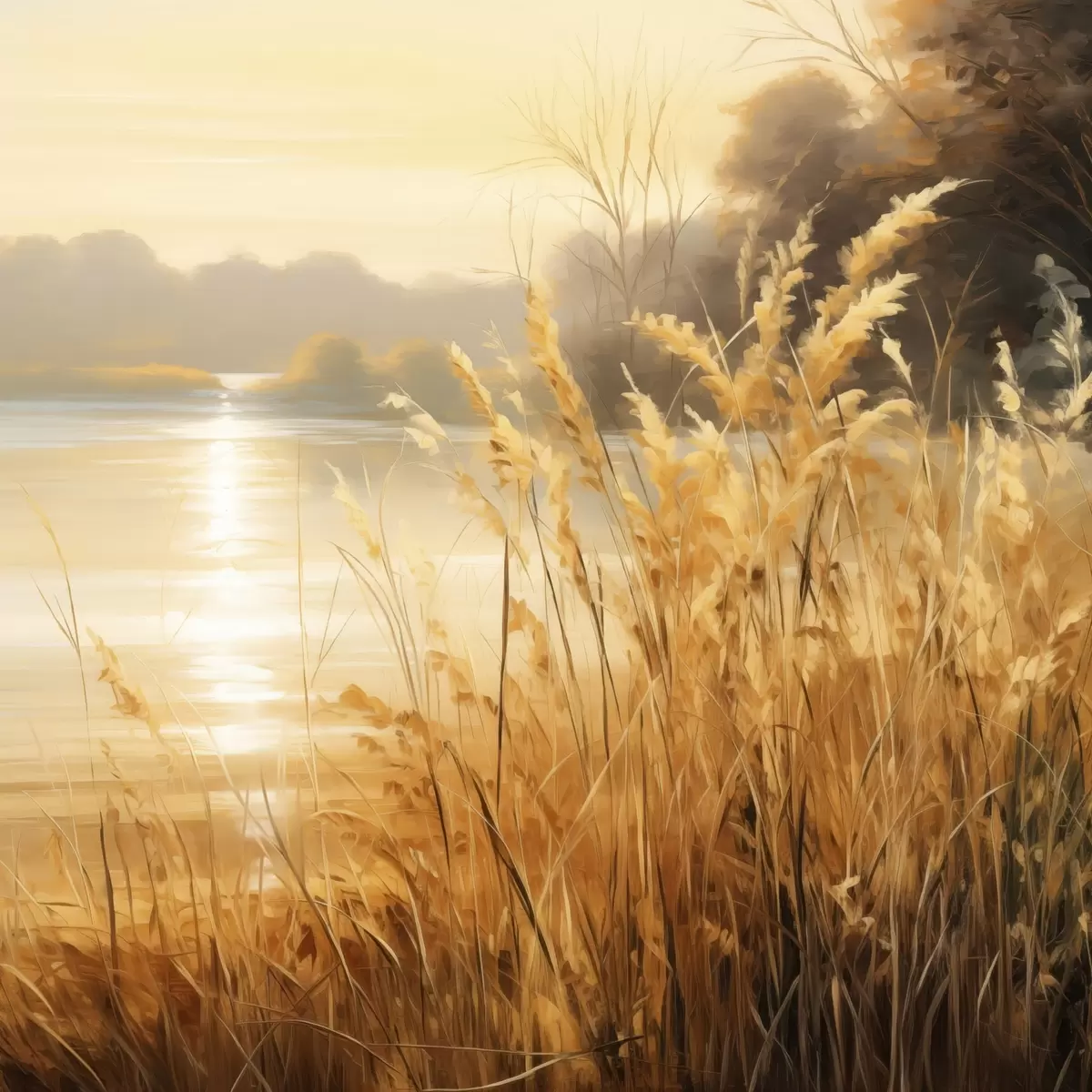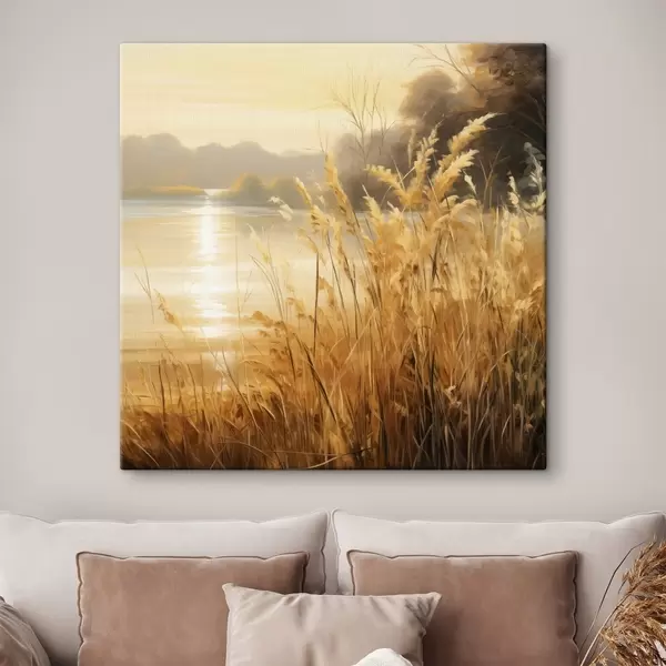 Cuadros Hierba alta y seca con espiguillas en primer plano, con un lago y árboles al fondo Nr s48393
