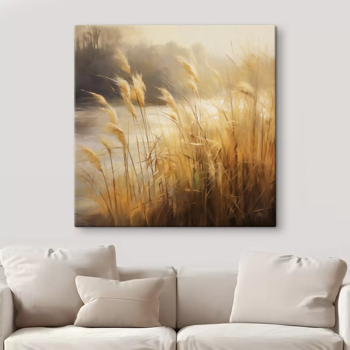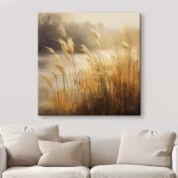 Cuadros Hierba alta y seca con espiguillas en primer plano, con un lago y árboles al fondo Nr s48394