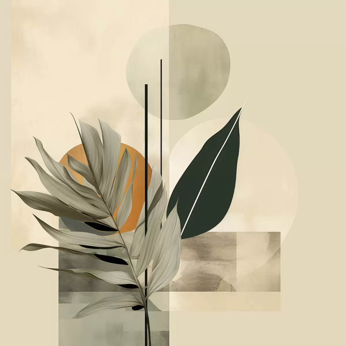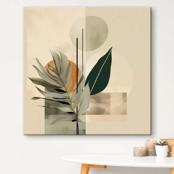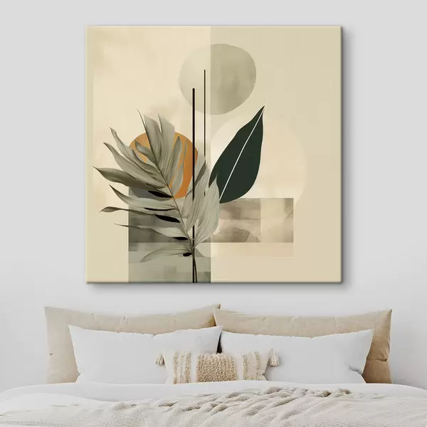 Cuadros Una planta de color verde oscuro con formas geométricas abstractas y texturas de acuarela en tonos beige y verde Nr s48410