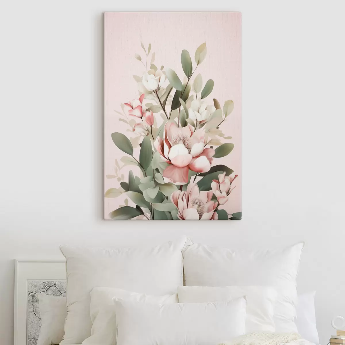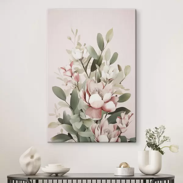 Cuadros Un ramo de flores en tonos pastel con hojas de eucalipto, sobre un fondo rosa pálido Nr s48727