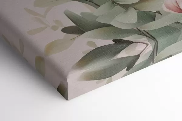 Cuadros Un ramo de flores en tonos pastel con hojas de eucalipto, sobre un fondo rosa pálido Nr s48727