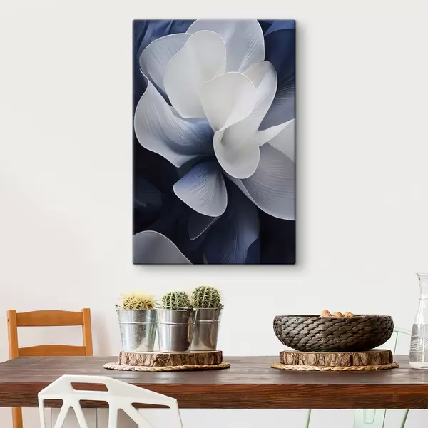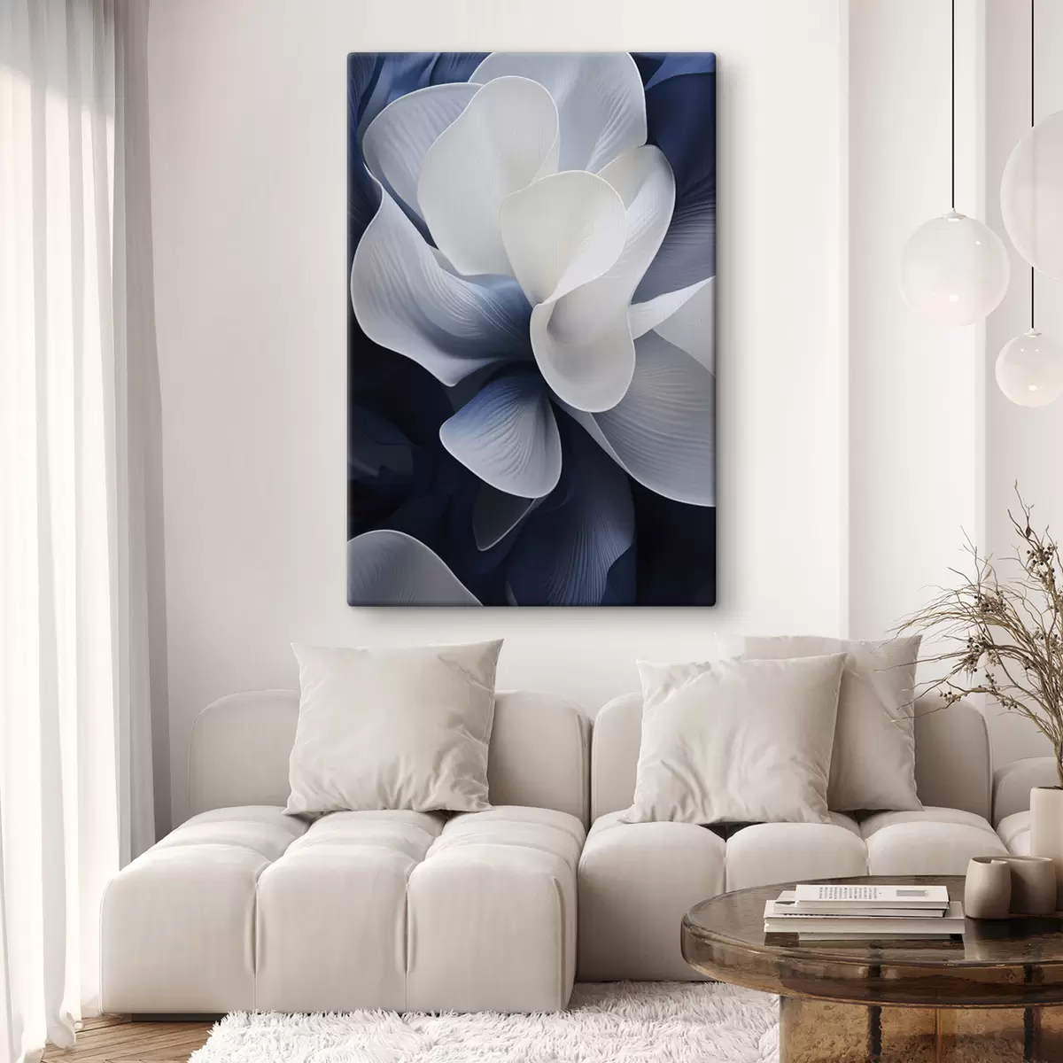 Cuadros Pétalos de flores abstractos en azul y blanco sobre fondo oscuro Nr s48732