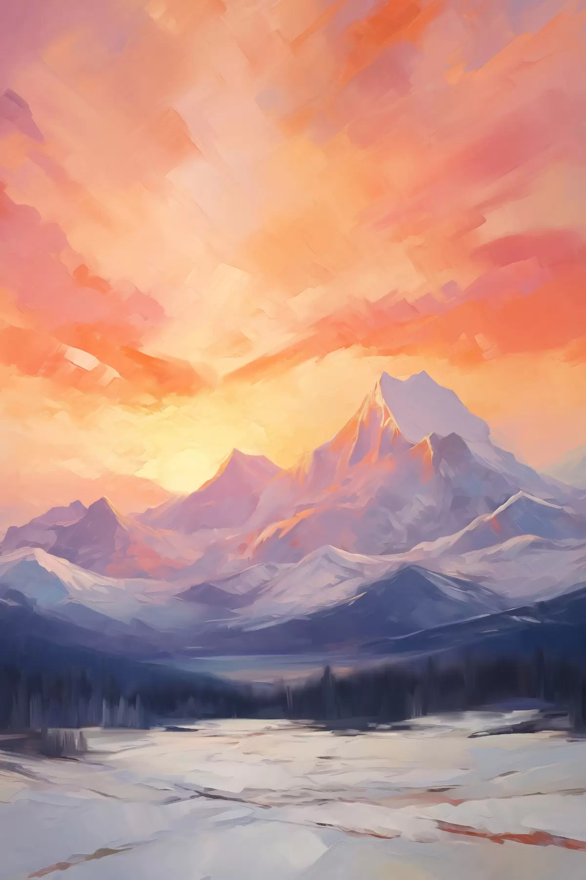 murales de pared Montañas nevadas bajo un cielo de vivos tonos naranjas y rosas salpicado de nubes s48741