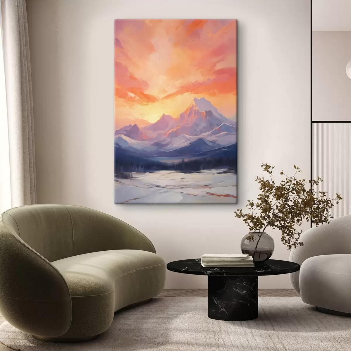 Cuadros Montañas nevadas bajo un cielo de vivos tonos naranjas y rosas salpicado de nubes Nr s48741