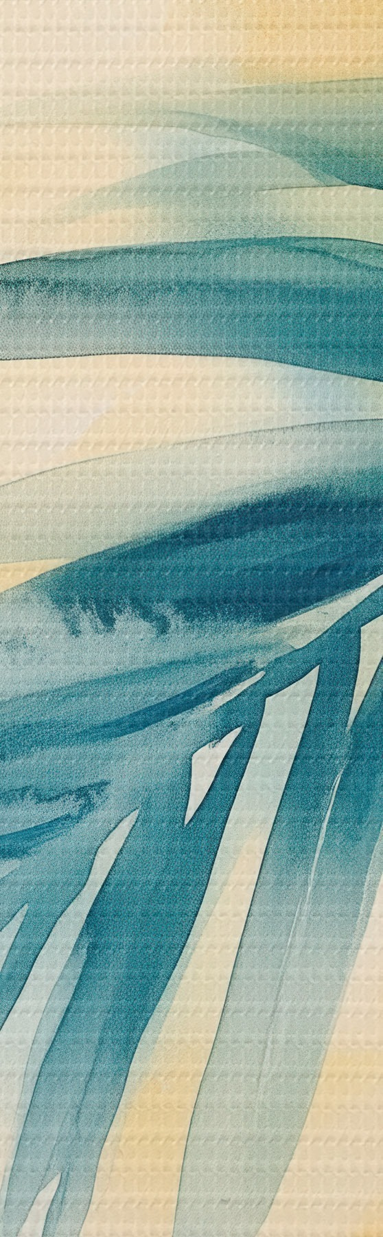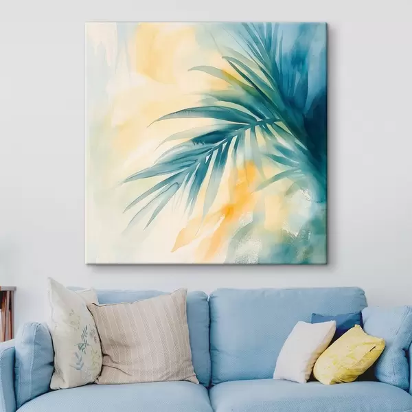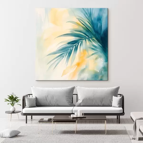 Cuadros Hojas de palmera tropical en tonos azul turquesa sobre un fondo de cálidas manchas de acuarela Nr s48849