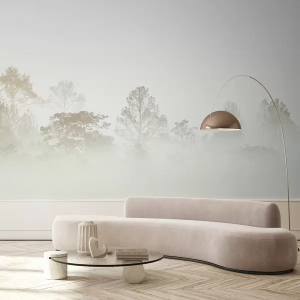 Fotomurales Silueta de una arboleda en la espesa niebla blanca de la mañana Nr. u97405